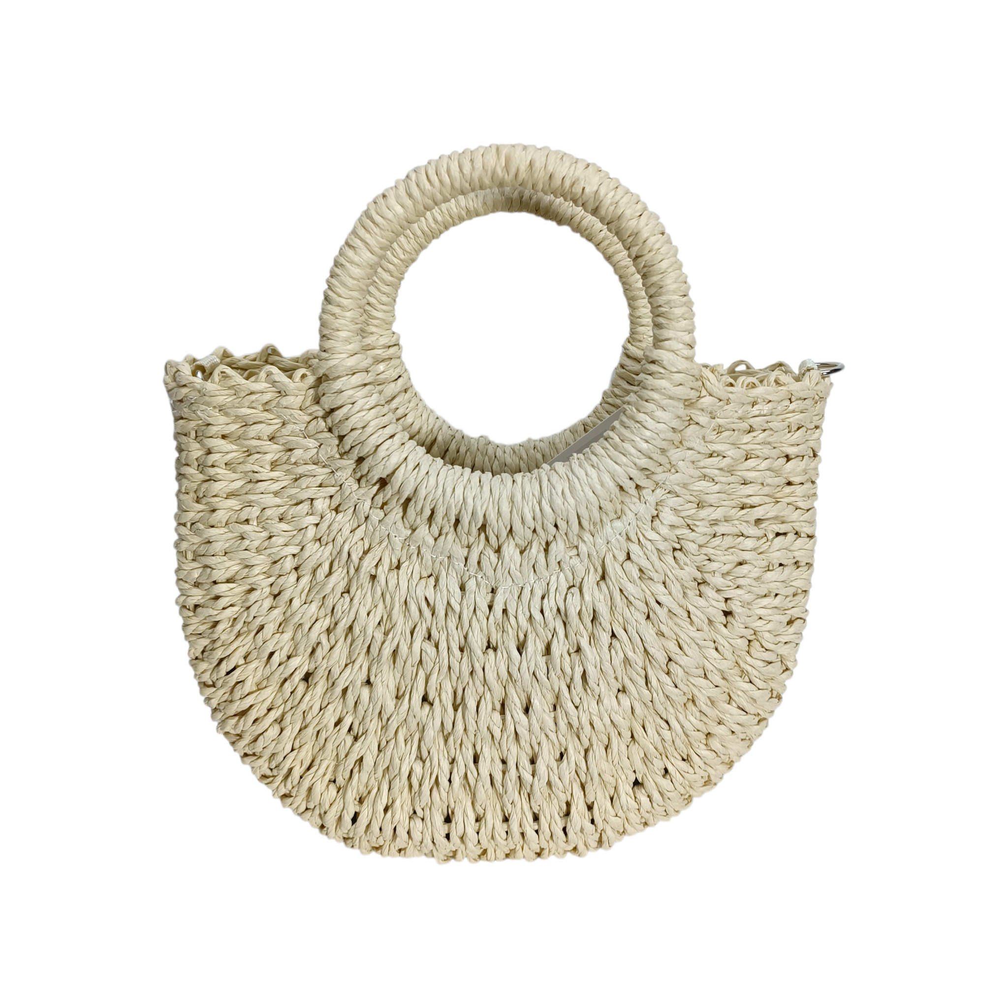 Elaborado en material tipo paja tejida, este bolso destaca por su acabado artesanal que aporta un toque auténtico y sofisticado. Sus asas redondeadas del mismo material permiten llevarlo cómodamente en la mano o al antebrazo, ideal para acompañarte durante un día de sol, arena y descanso.