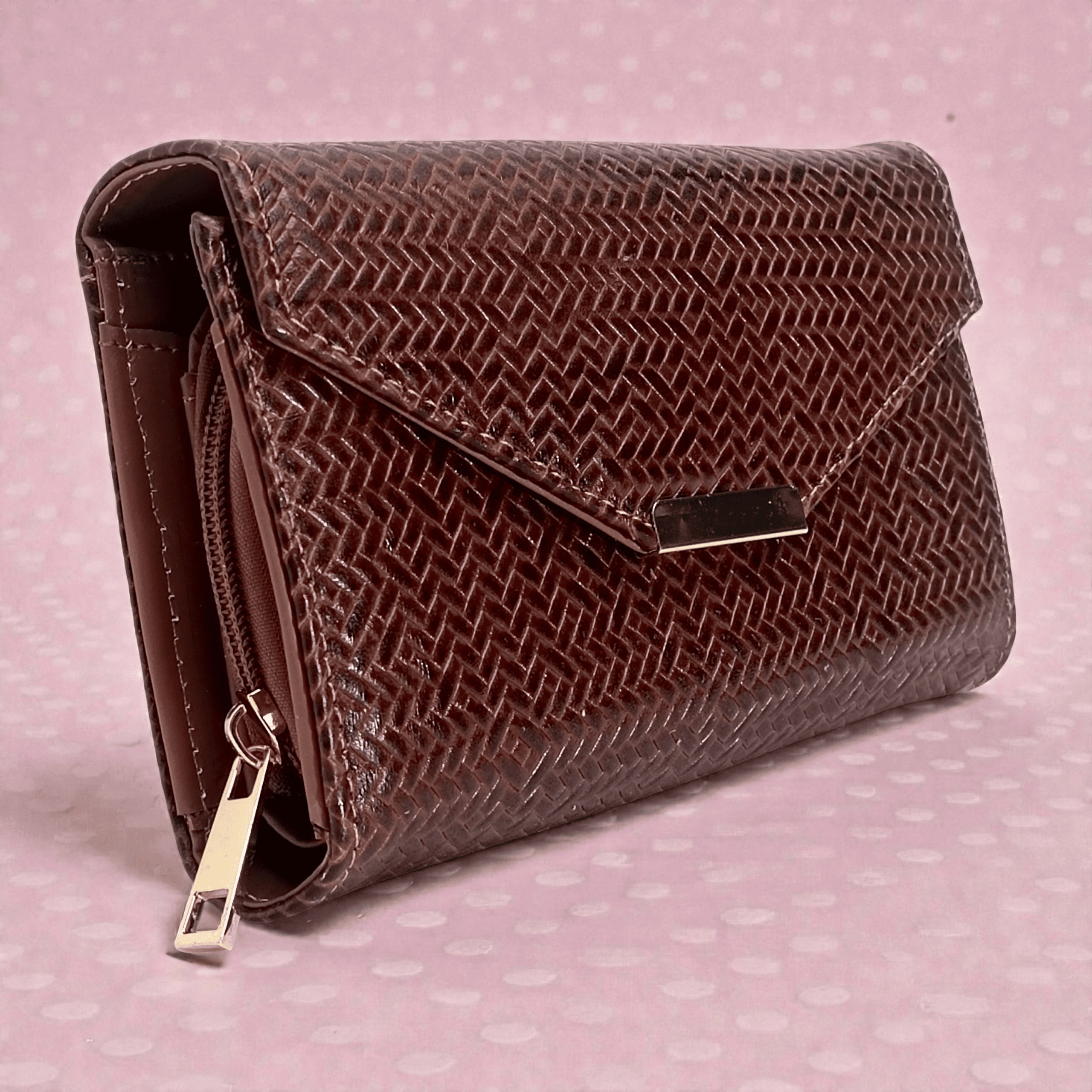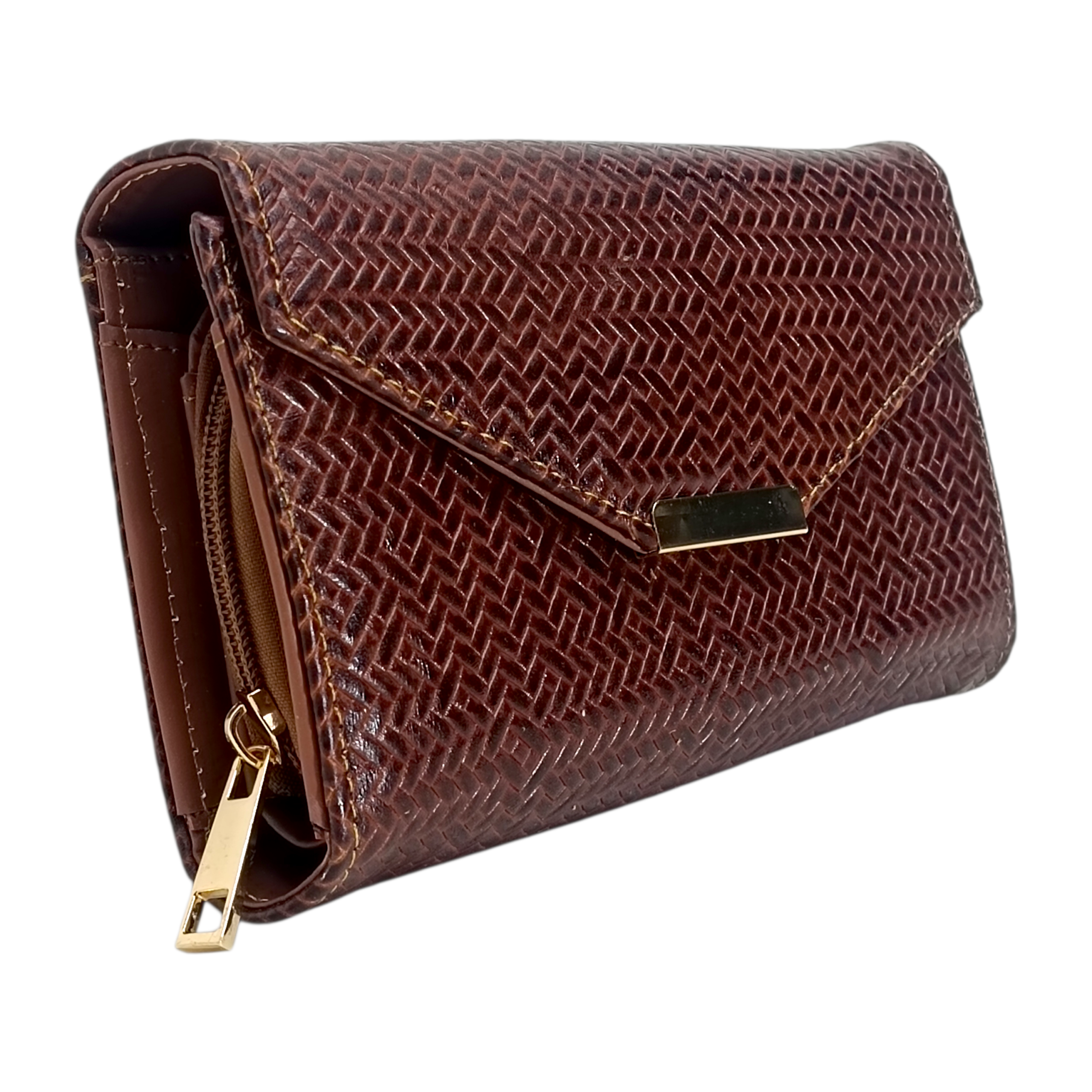 Descripción: Esta cartera en tono café combina elegancia y funcionalidad en un diseño atemporal. Elaborada con acabado tipo piel tejida, destaca por su textura sofisticada que aporta un toque artesanal y moderno a la vez. Su diseño tipo sobre con broche metálico dorado al frente le da un aire refinado, ideal para quienes buscan un accesorio práctico sin perder estilo.