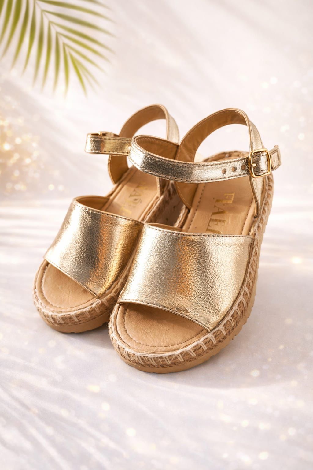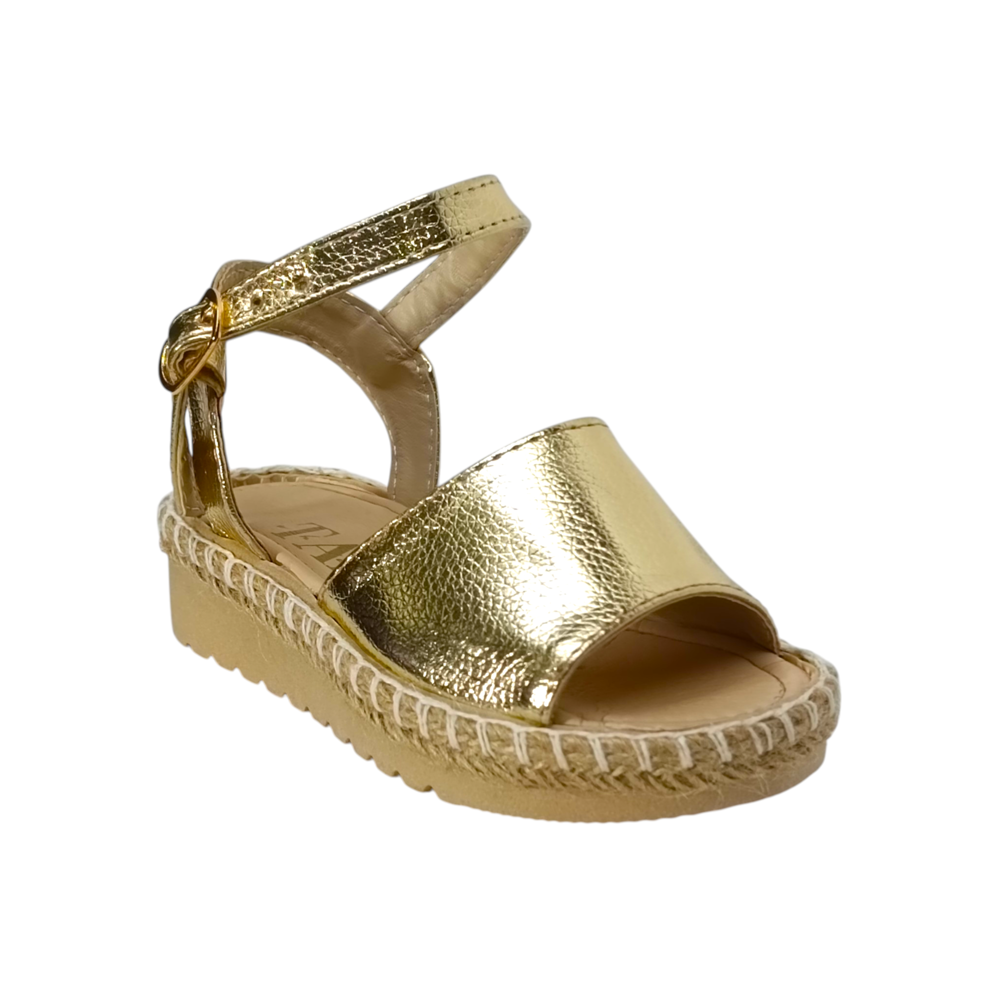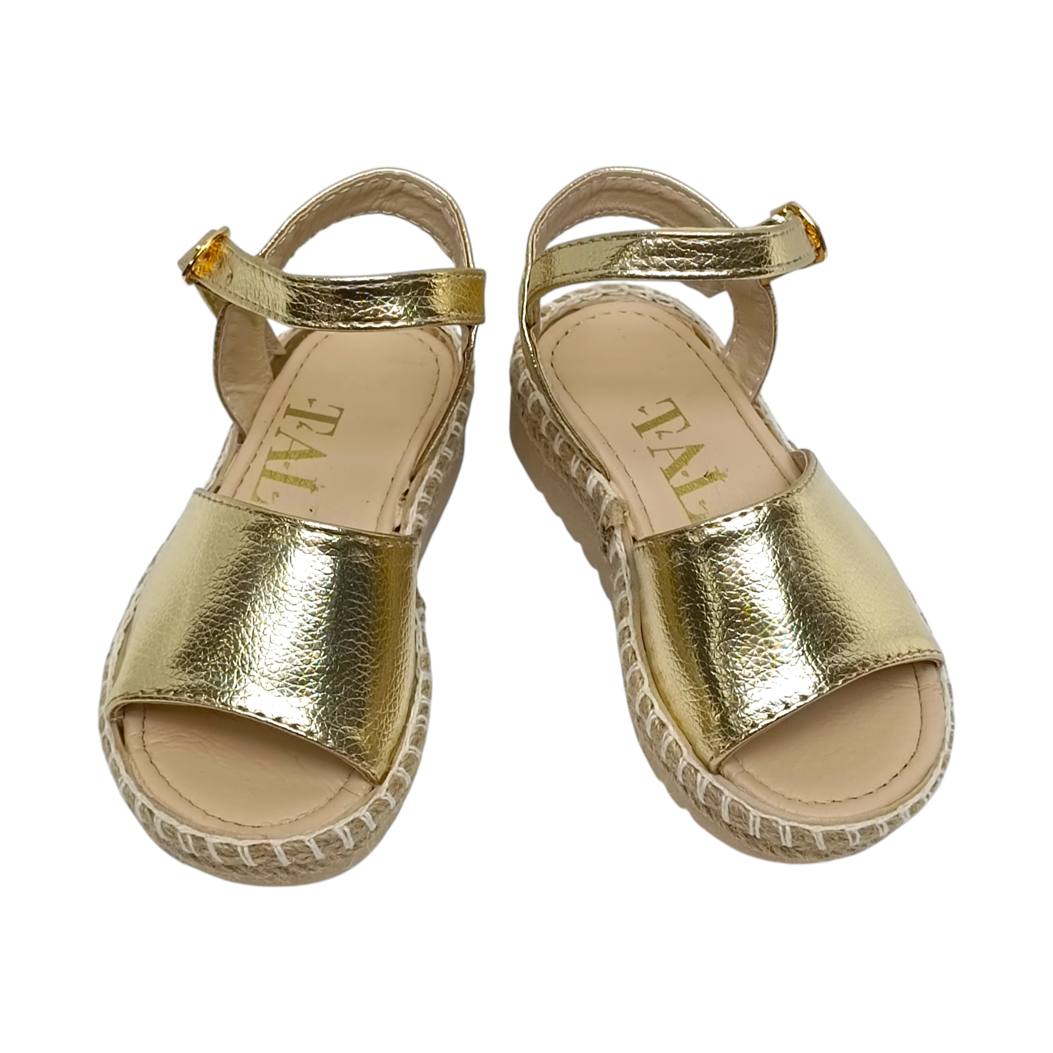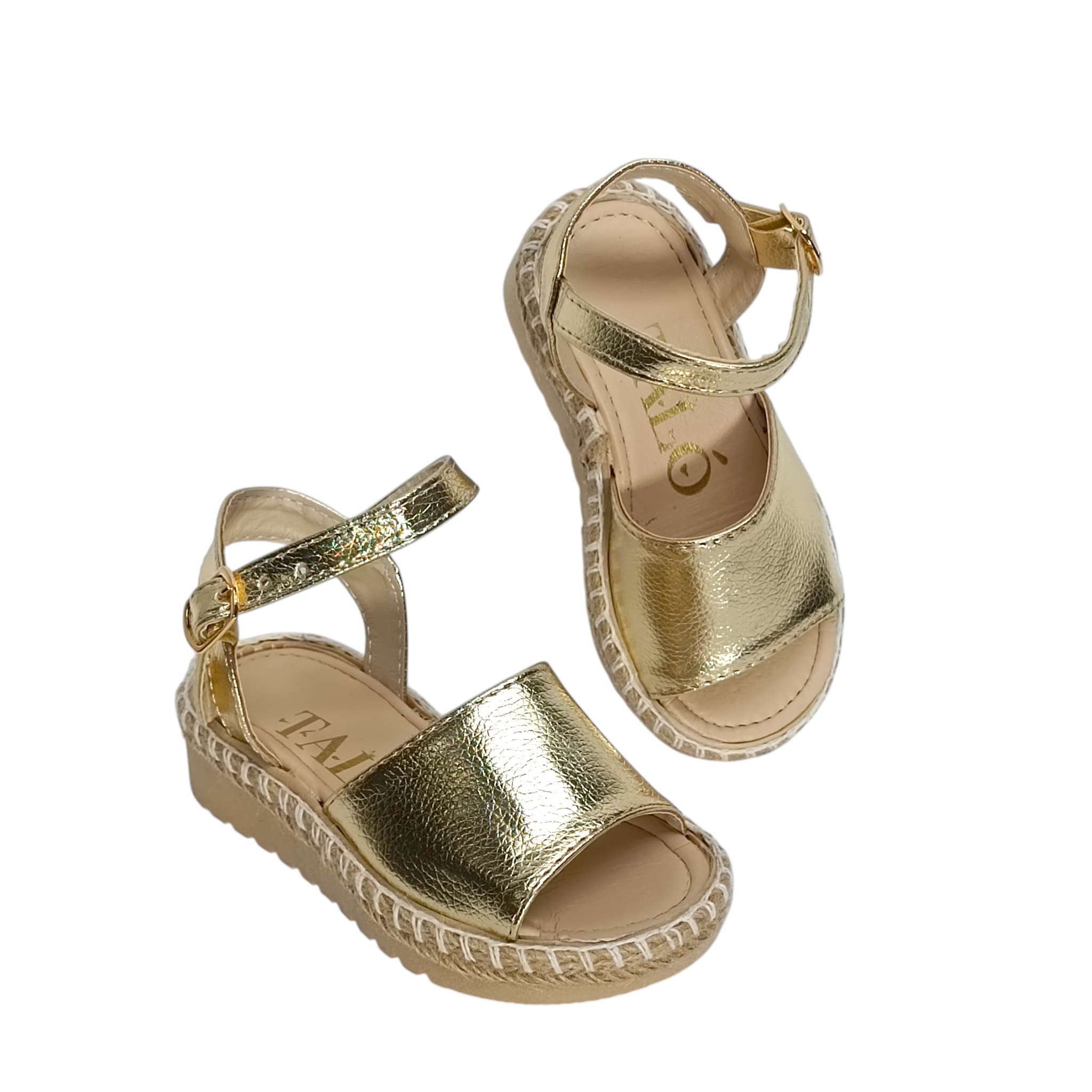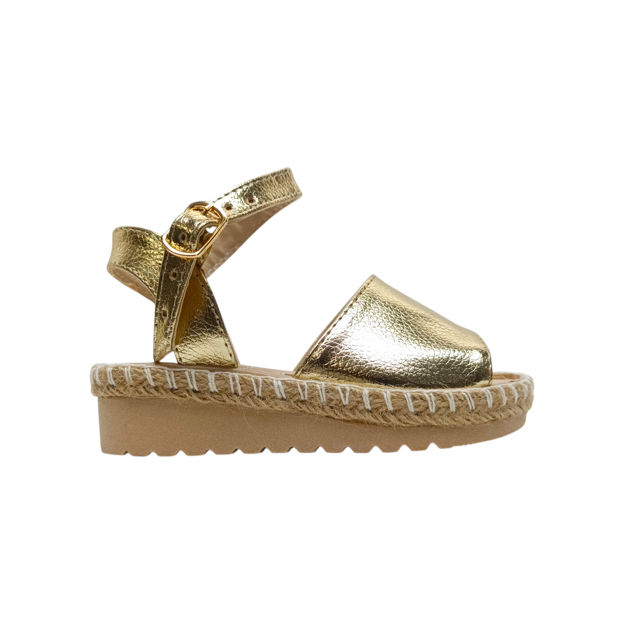 Estas hermosas alpargatas infantiles en color oro metálico son el complemento ideal para darle un toque elegante y moderno a cualquier outfit. Su diseño combina un acabado brillante tipo piel metálica con suela estilo yute, creando un equilibrio perfecto entre frescura, tendencia y comodidad.