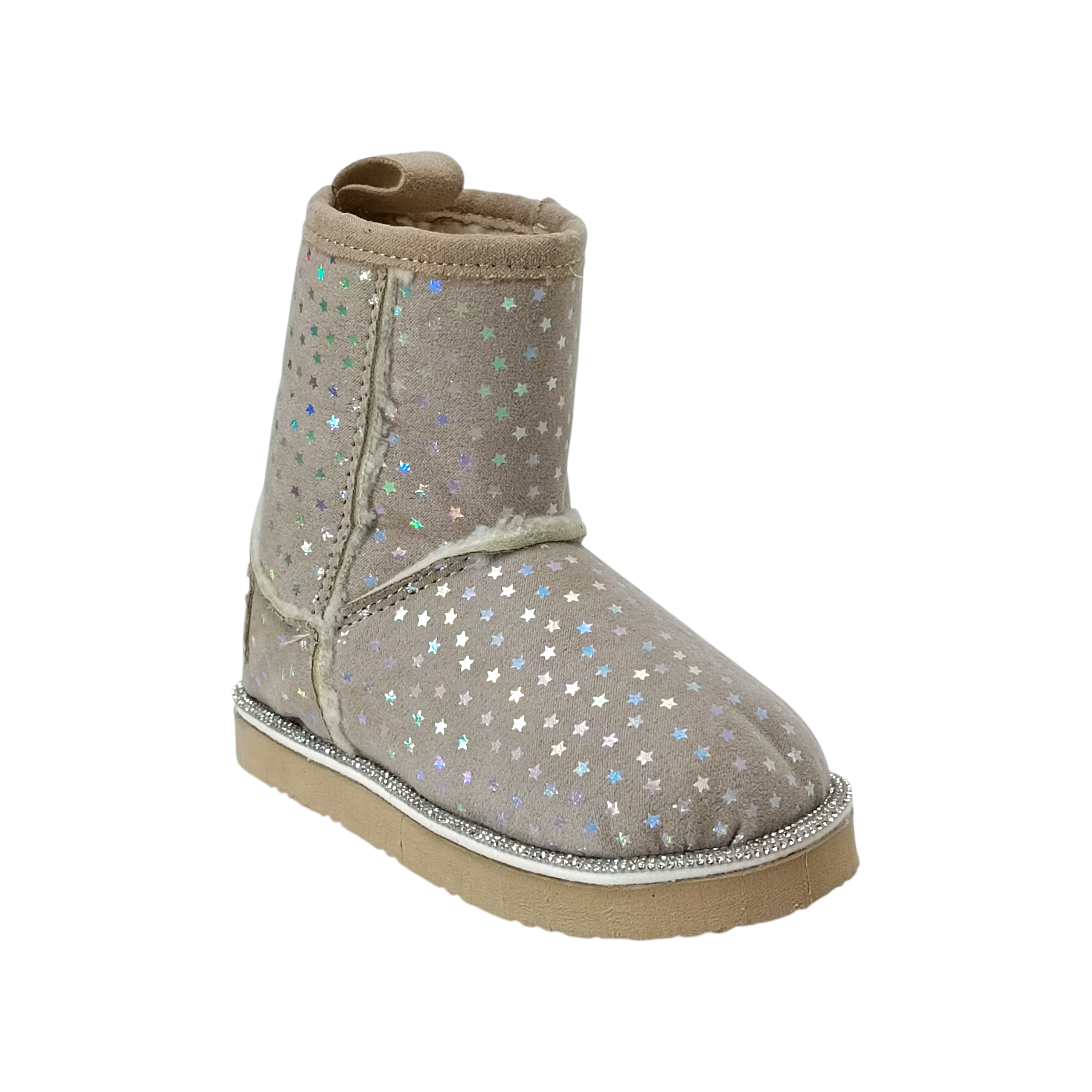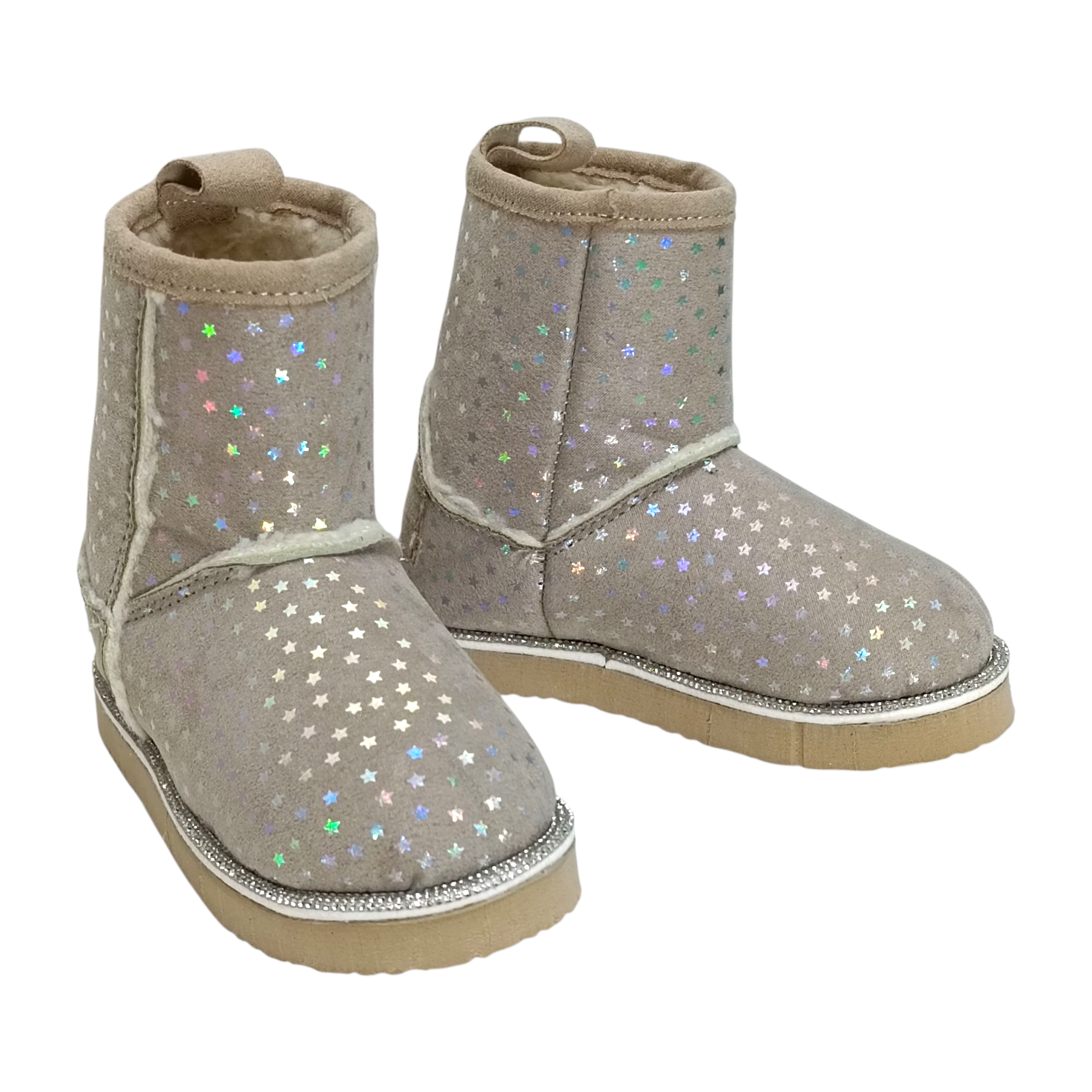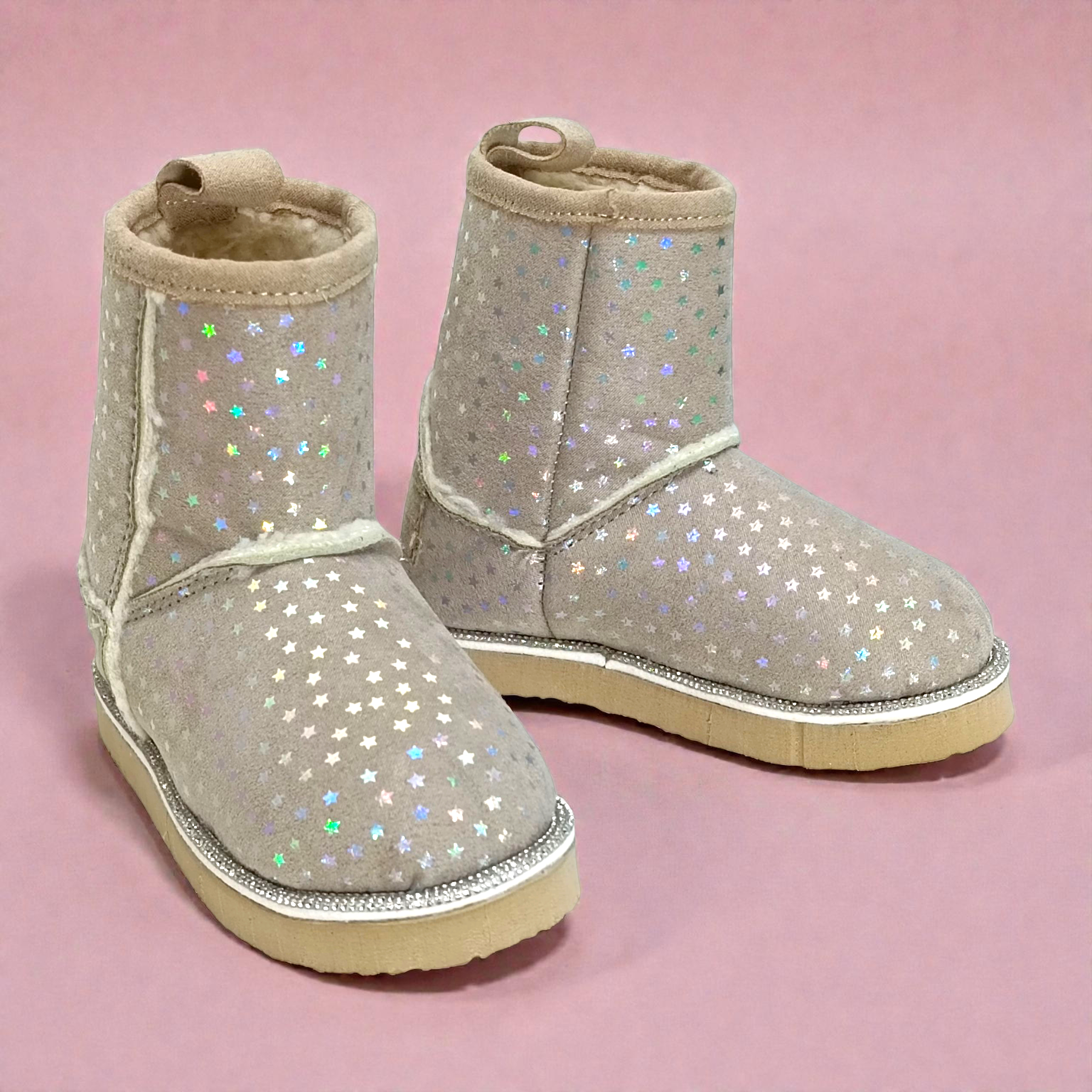 Descripción: Suaves, calientitas y llenas de magia. Estas botitas infantiles están diseñadas para que cada paso brille. Su exterior aterciopelado está cubierto de pequeñas estrellas holográficas que destellan con el movimiento, dándole un toque divertido y súper tierno.