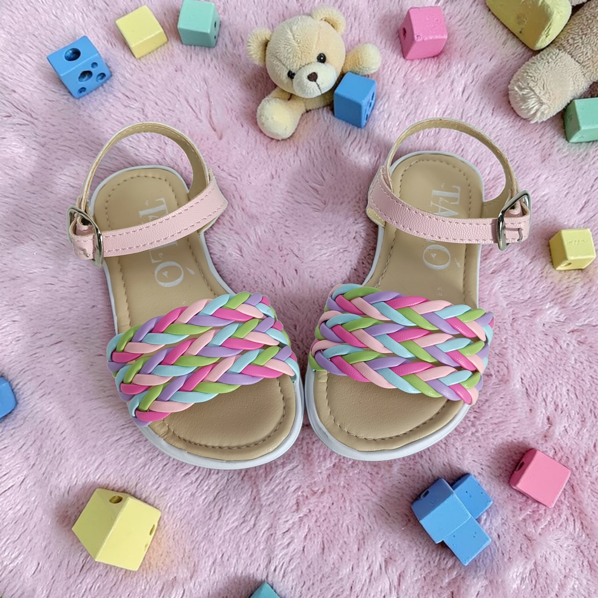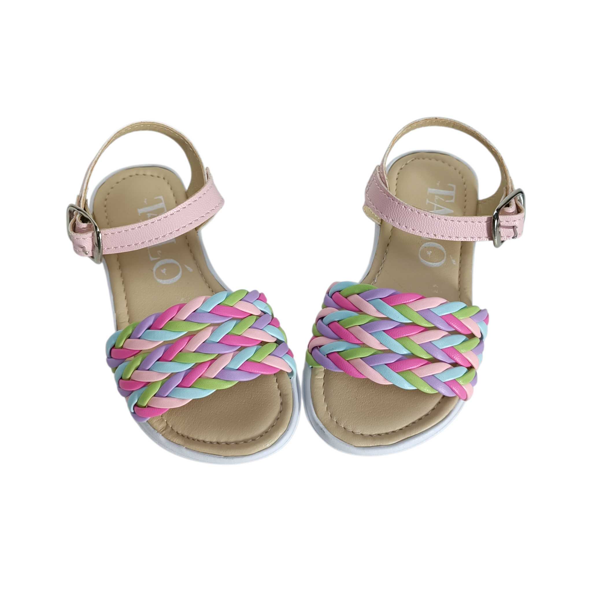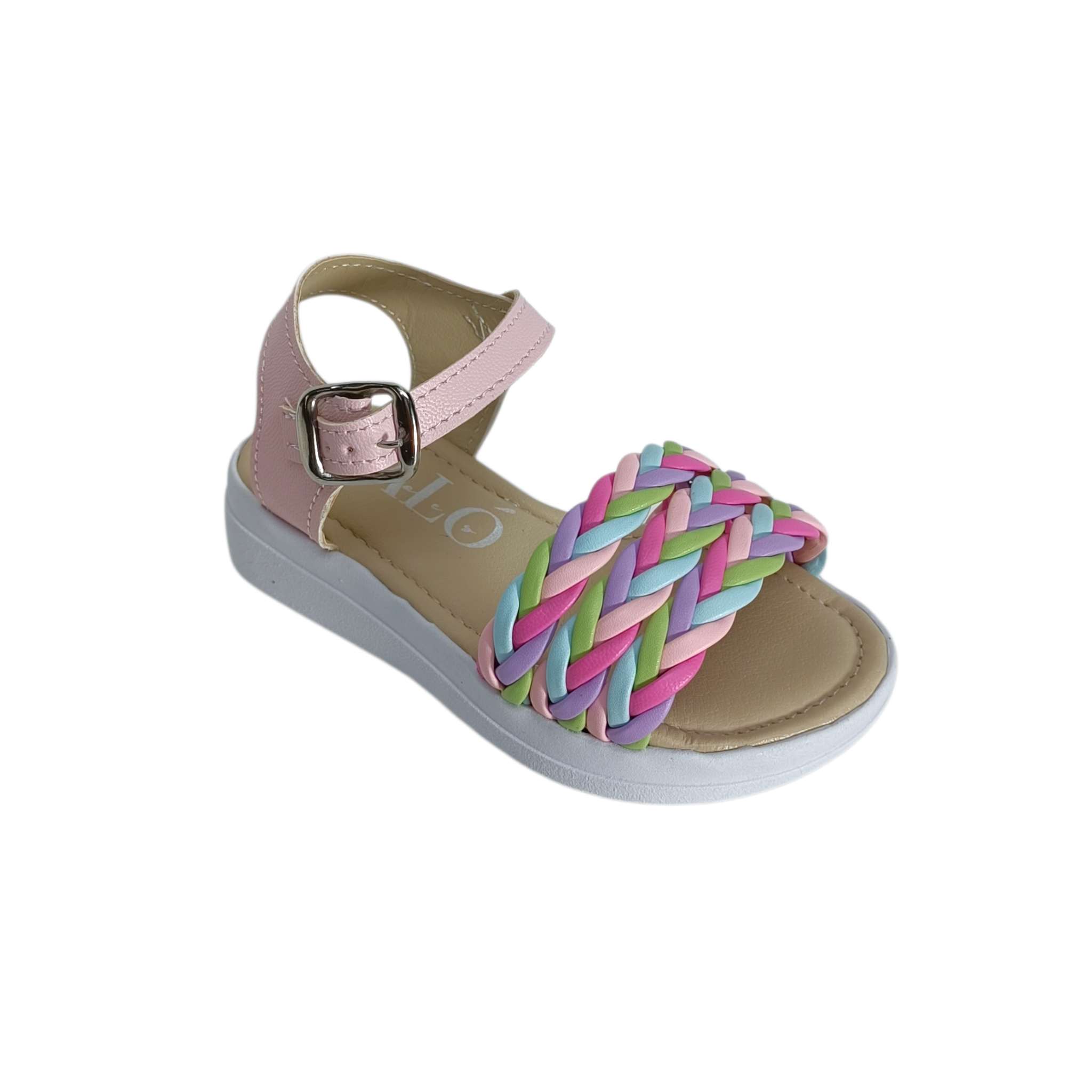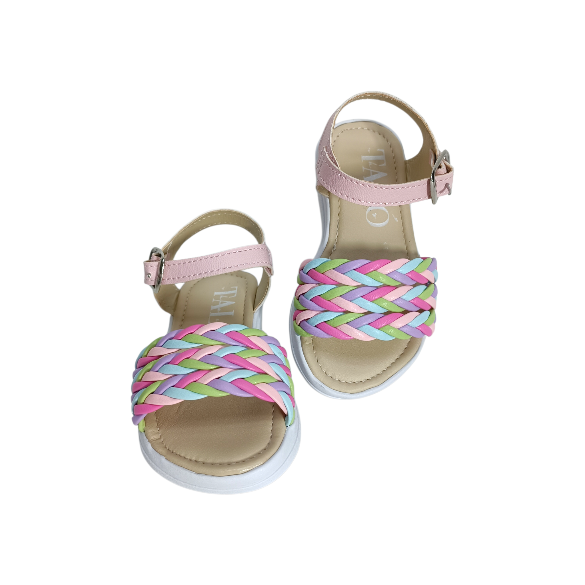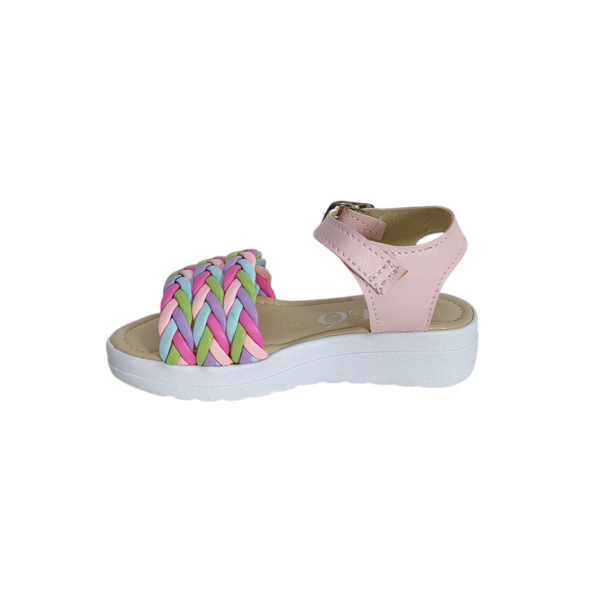 Estas hermosas sandalias infantiles tipo huarache combinan comodidad y alegría en un diseño lleno de color. Su parte frontal presenta una trenza multicolor en tonos pastel como rosa, lila, verde y azul, creando un estilo divertido, fresco y perfecto para la temporada.