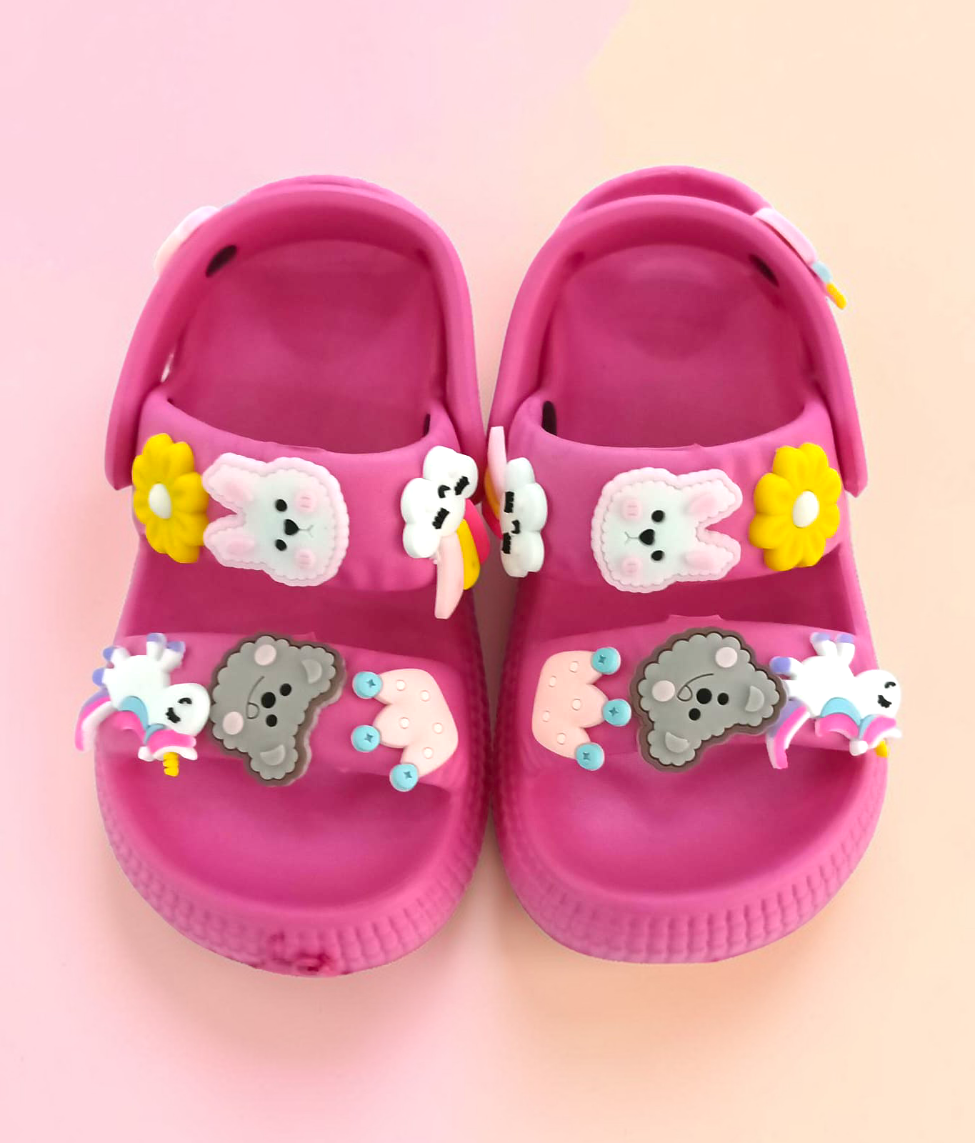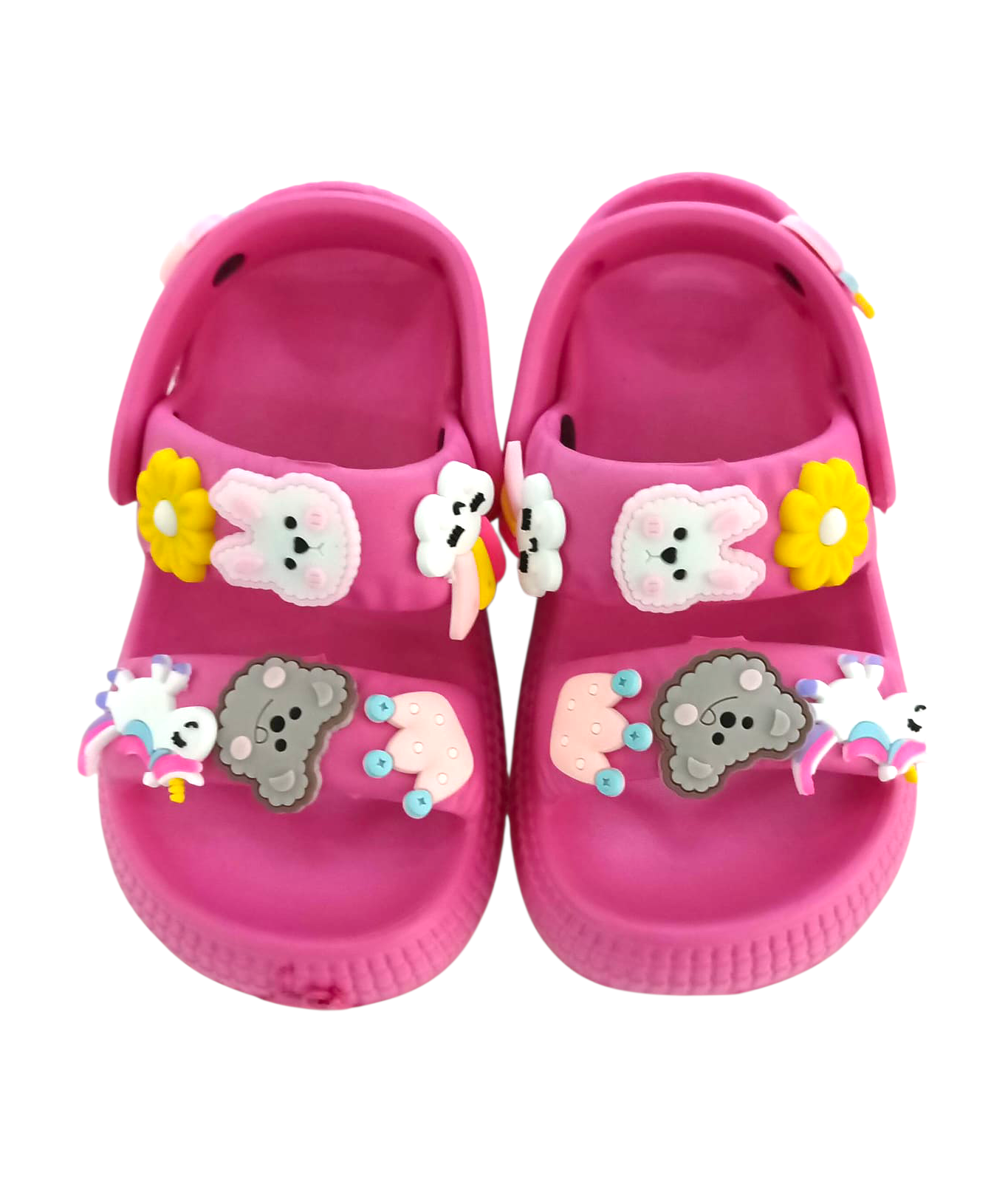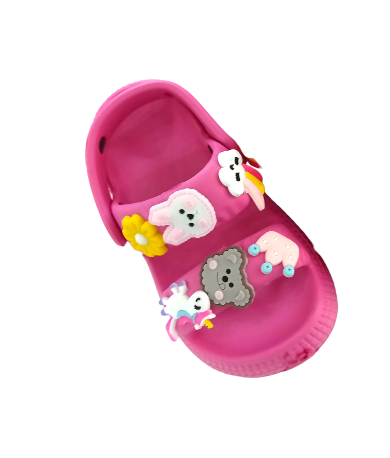 Descripción: Estas sandalias infantiles con pines coloridos están diseñadas en un práctico estilo tipo zueco, combinando comodidad, ligereza y mucha personalidad. Su base en color blanco resalta perfectamente los adorables pines decorativos con figuras divertidas y colores vibrantes, que les dan un toque único y súper llamativo.