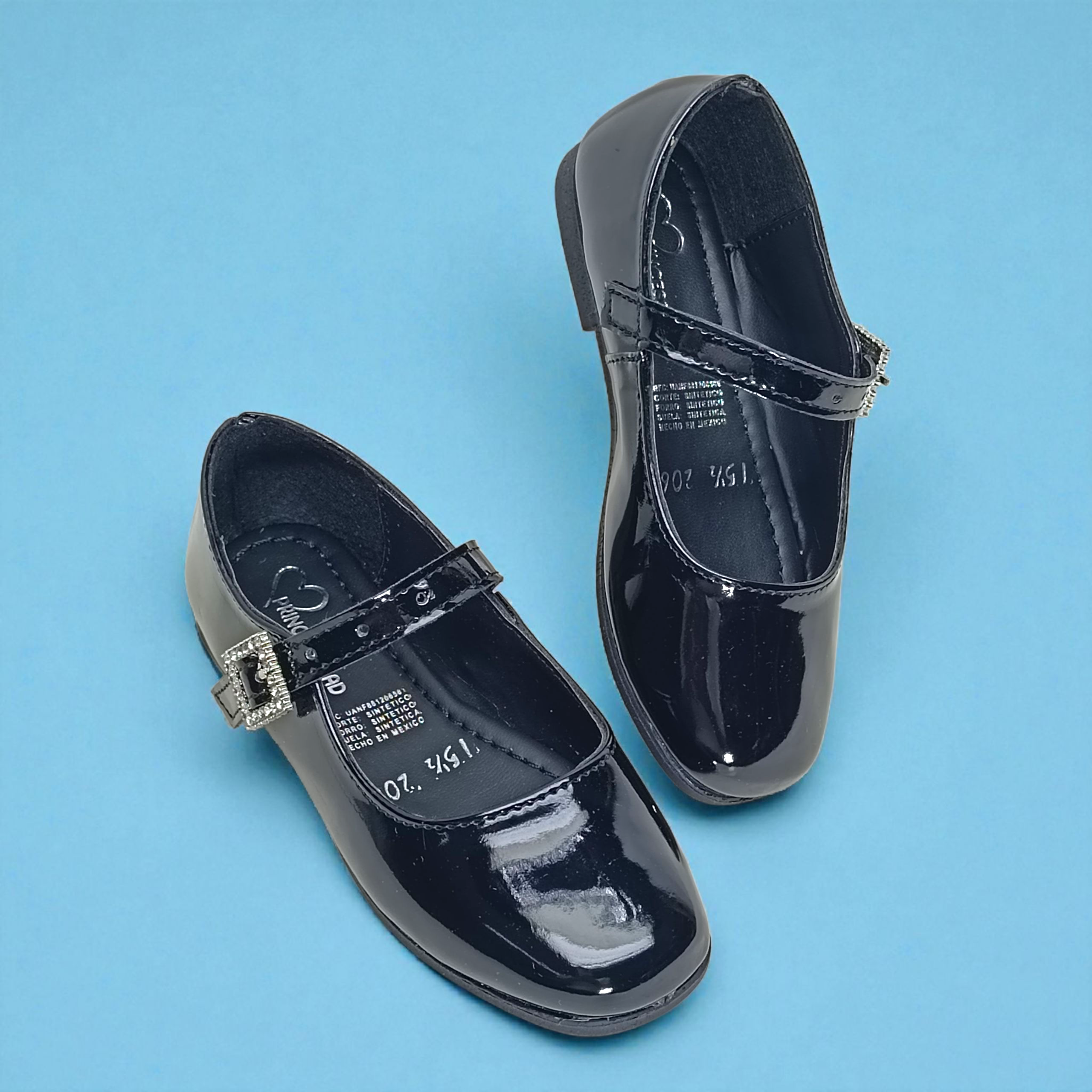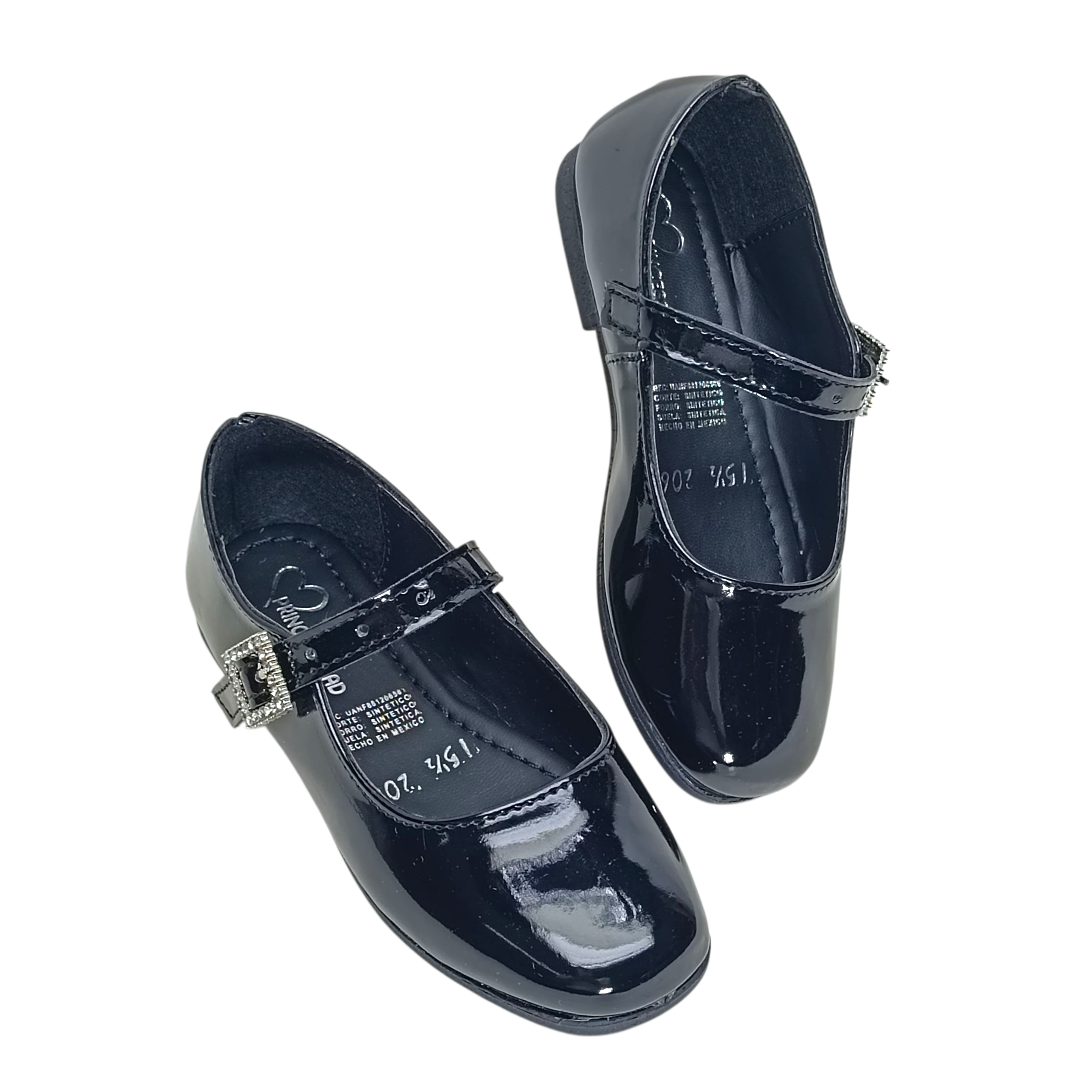 Descripción: Valerinas de piso infantiles en color negro de charol. Cuenta con una tira delgada en la parte del empeine. Detalles en tonos plateados.