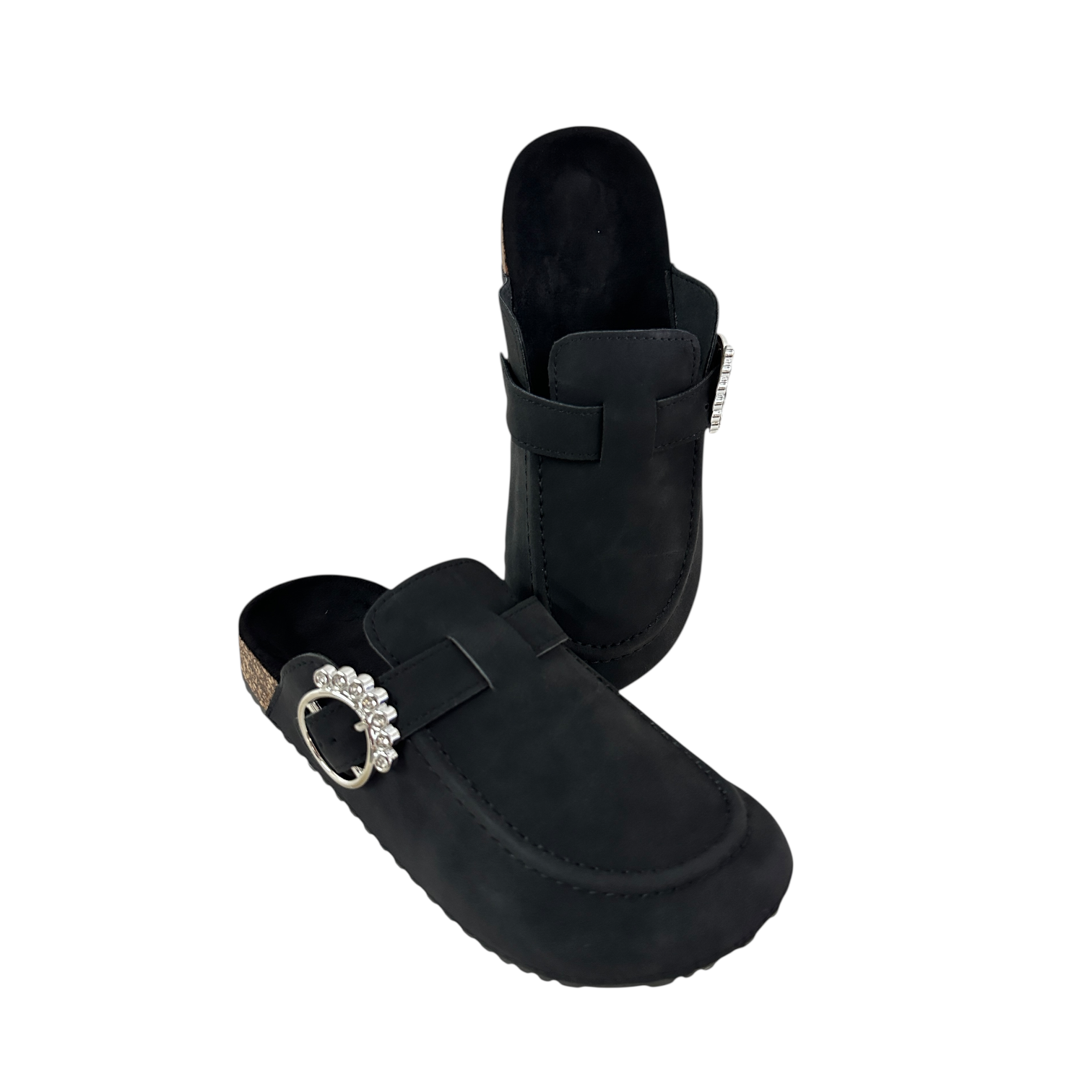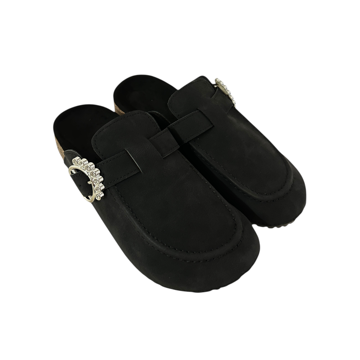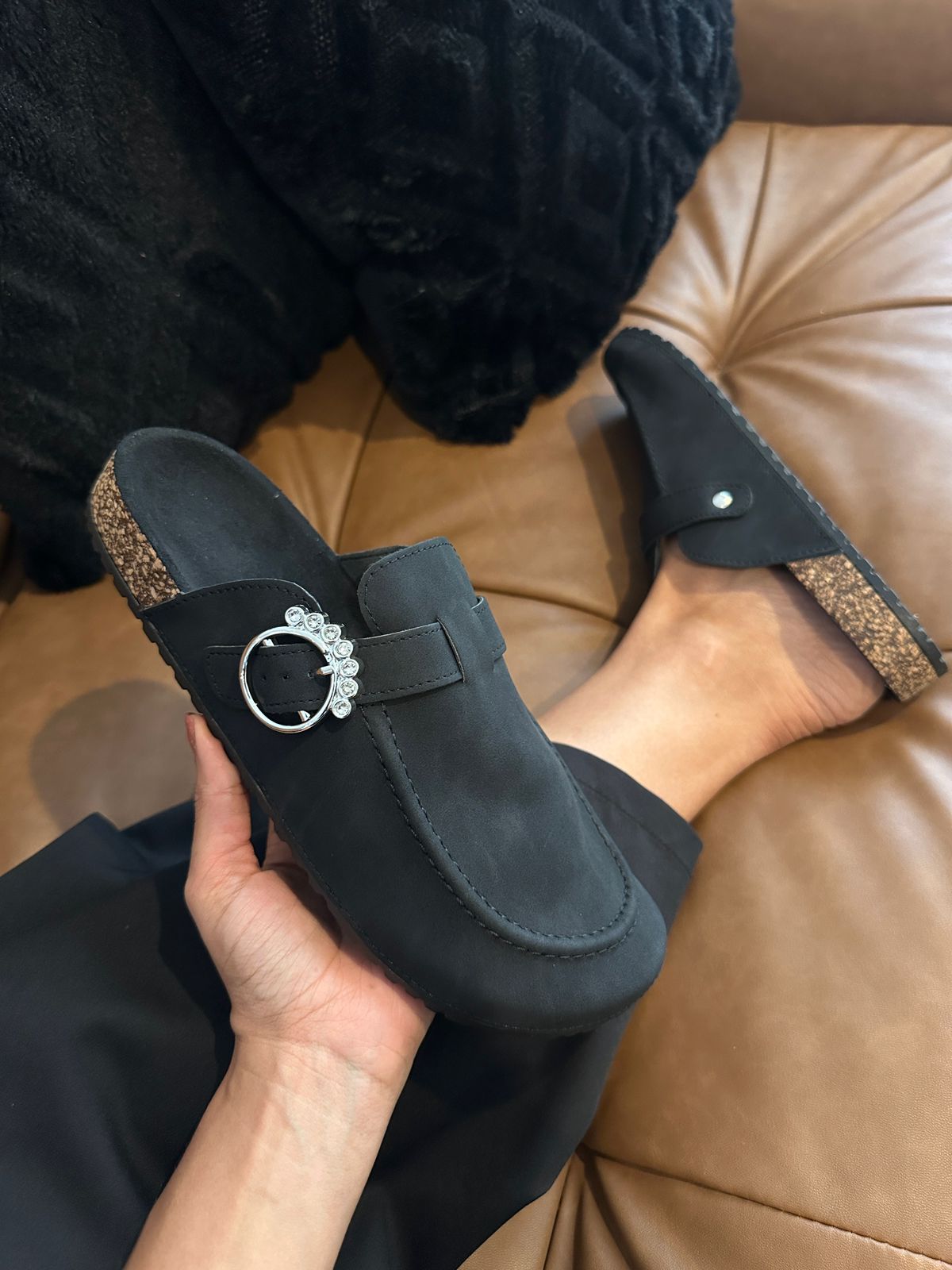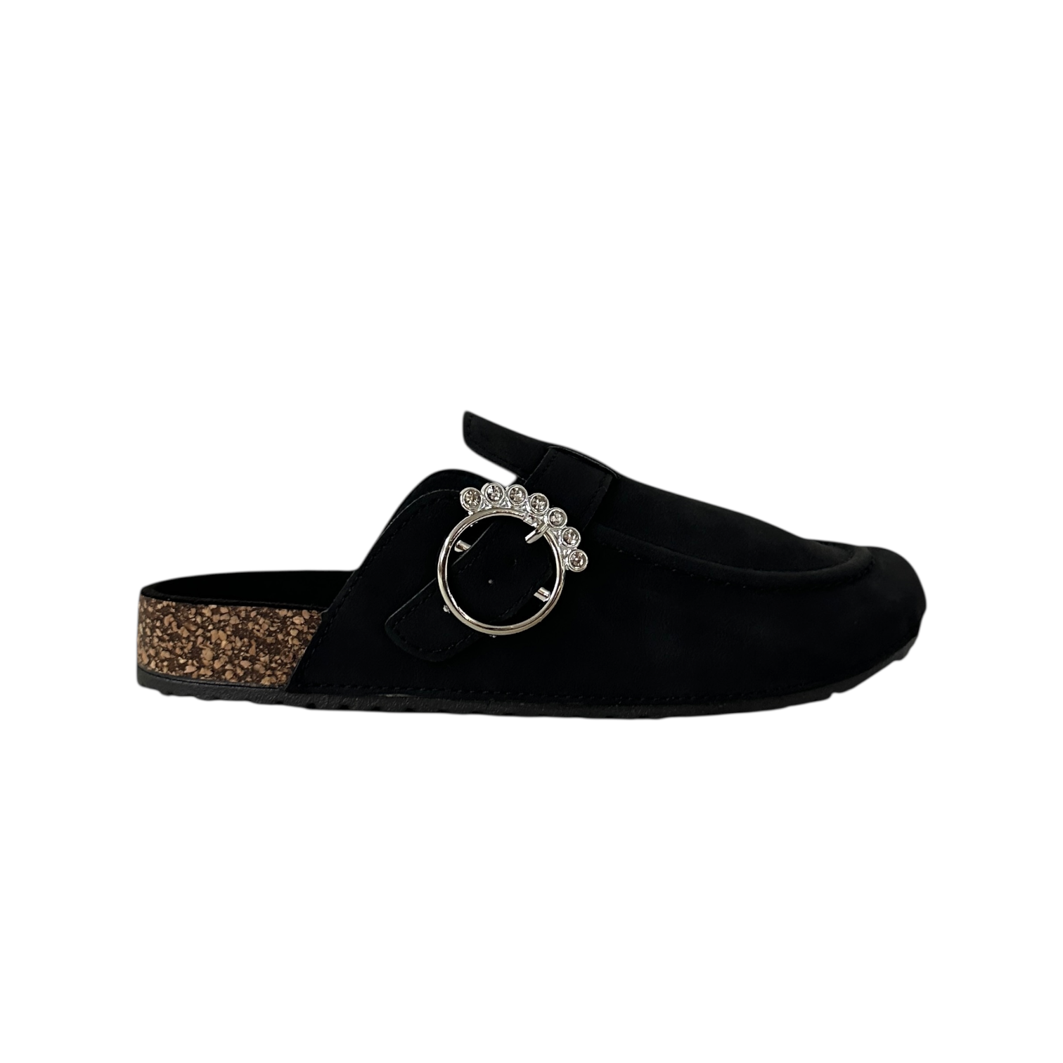 Este elegante mule en color negro combina estilo y comodidad a la perfección. Confeccionado en un acabado tipo gamuza suave al tacto, presenta una silueta cerrada en la parte delantera y descubierta en el talón, ideal para un look casual pero sofisticado. Su distintiva hebilla metálica lateral adornada con pedrería brillante añade un toque de glamour, convirtiéndolo en el complemento ideal para elevar cualquier atuendo. La suela de corcho aporta ligereza y confort, mientras que la base de goma asegura una pisada firme y antideslizante. Perfecto para usar tanto en interiores como en salidas informales, este mule es una fusión de diseño moderno y practicidad.