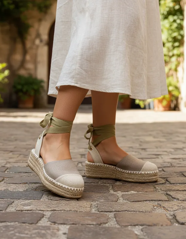 Descripción: Siente la esencia del verano con esta encantadora alpargata en color beige, el equilibrio perfecto entre frescura y elegancia. Su diseño clásico de punta cerrada en lona transpirable te acompañará en los días más cálidos, mientras que su suela de yute natural te transporta a destinos paradisíacos con cada paso. Los lazos que se ajustan alrededor del tobillo le añaden un toque romántico y femenino, ideal para paseos al atardecer. Ligera, cómoda y versátil, esta alpargata es la compañera ideal para un verano lleno de estilo y aventura.
