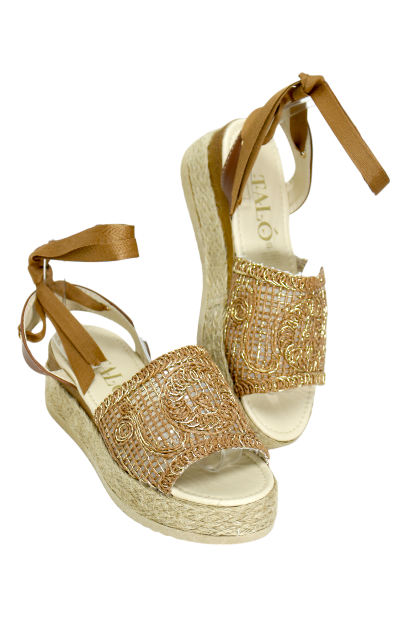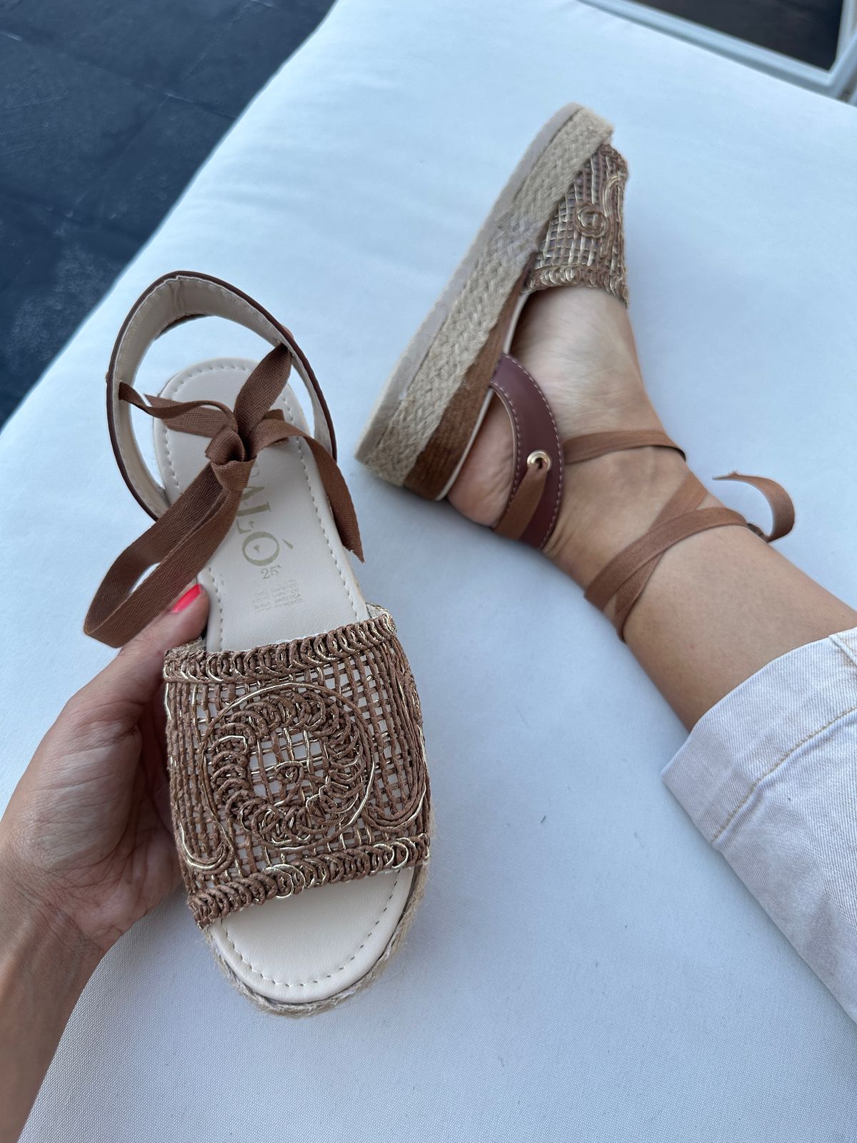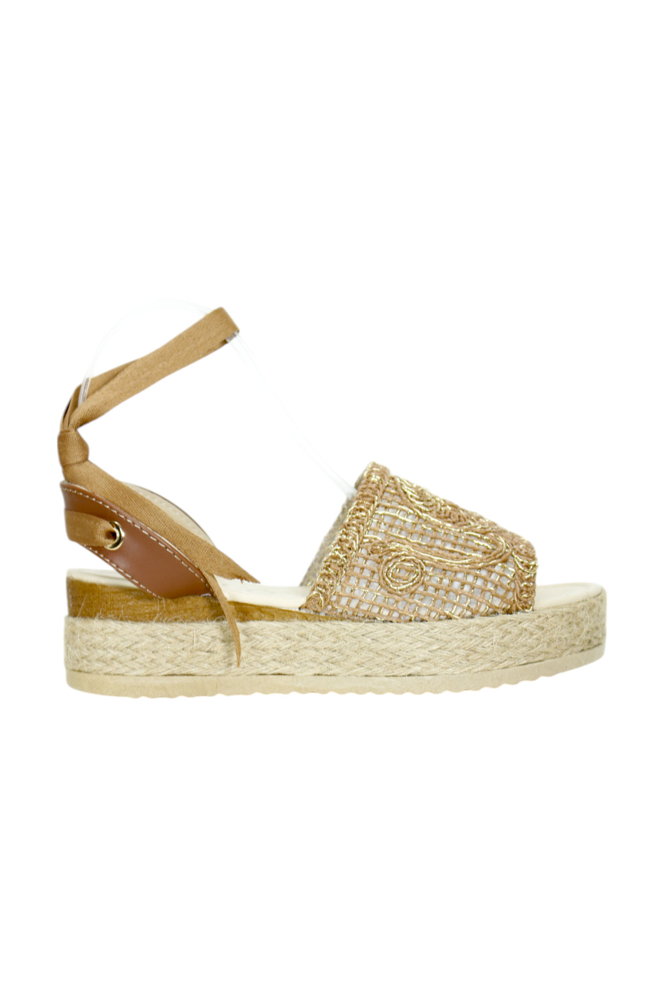 Cuenta con empeine de tejido tipo malla con bordado decorativo, que le da un acabado artesanal y elegante, permitiendo una apariencia ligera y fresca. Su plataforma forrada en yute brinda altura sin sacrificar comodidad, logrando un equilibrio perfecto entre estilo y confort.