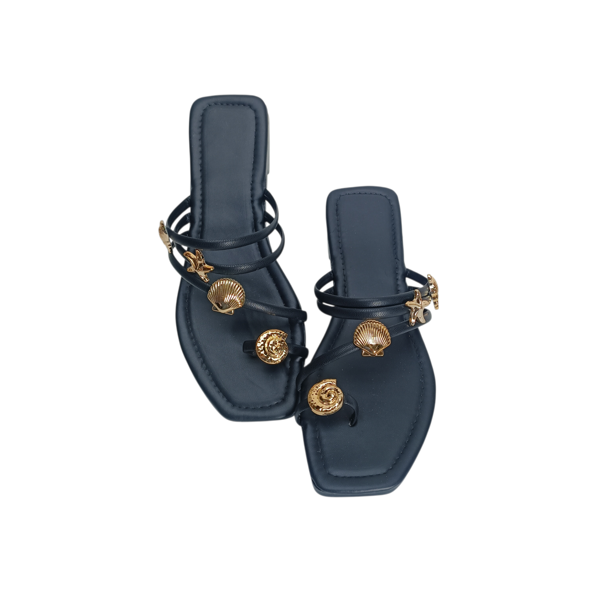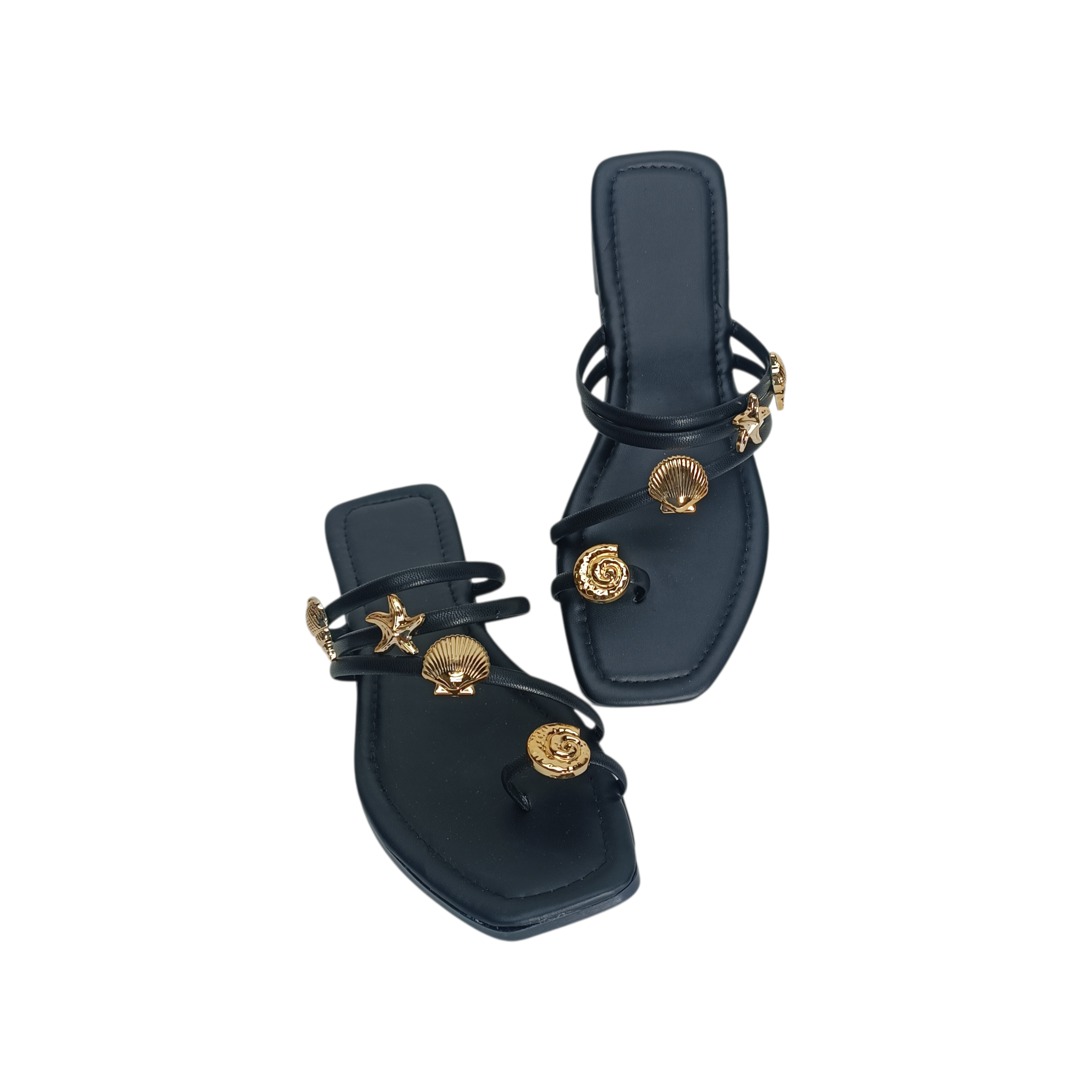 Cuenta con tiras delgadas lisas que cruzan el empeine, brindando un ajuste cómodo y ligero al caminar. Su principal atractivo son los apliques metálicos en tono dorado con inspiración marina, como conchas y caracoles, que aportan un estilo femenino, veraniego y muy en tendencia. El contraste entre el blanco limpio y el dorado brillante crea un efecto visual elegante y moderno.