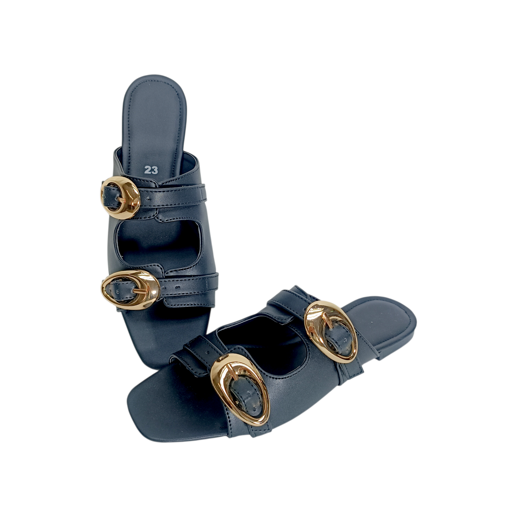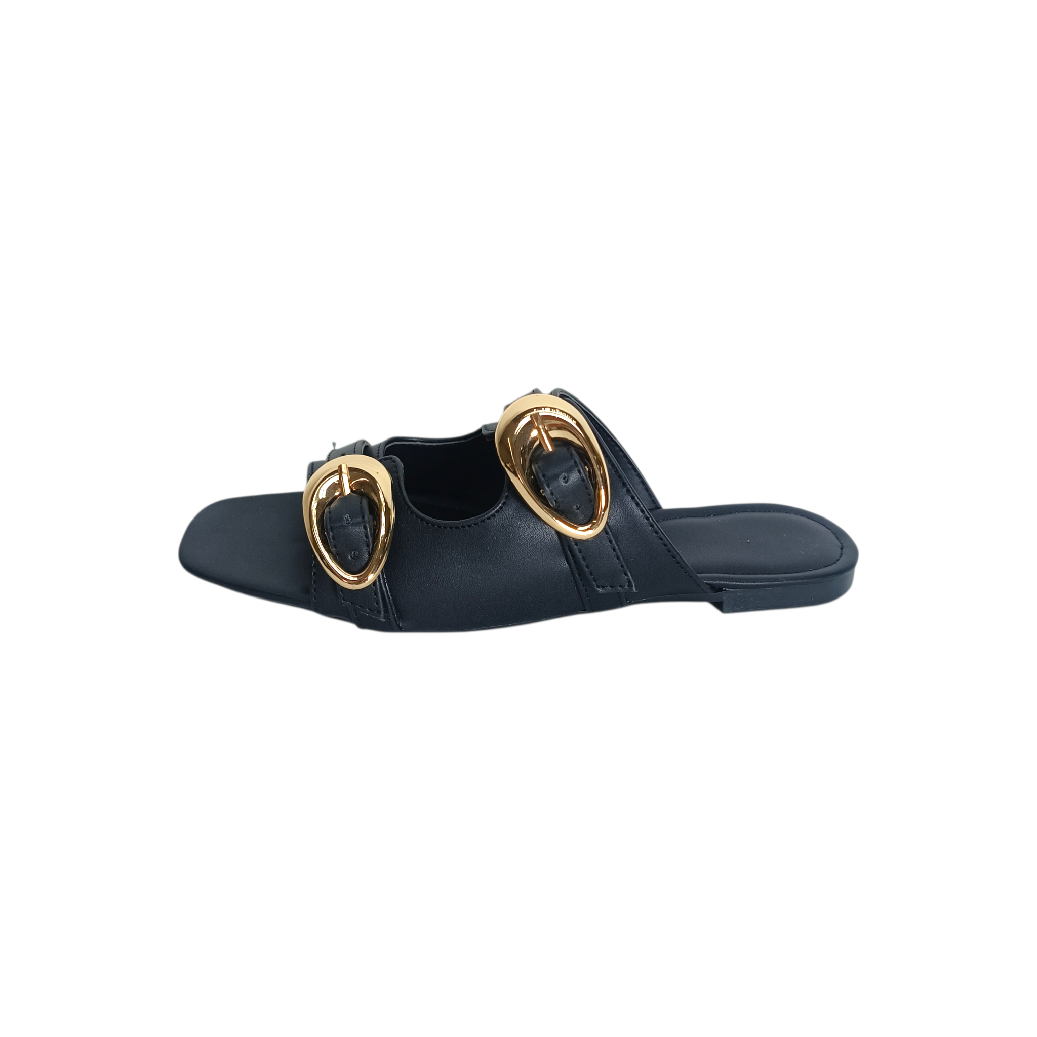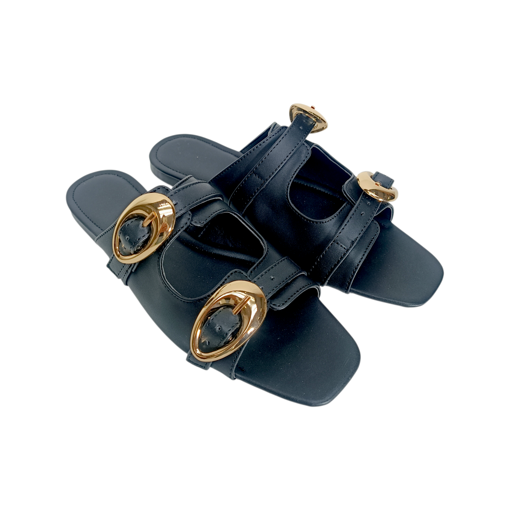 Descripción: Dale a tu look un toque elegante y moderno con estas sandalias tipo mule en color negro, el complemento perfecto para cualquier outfit de temporada. Su diseño minimalista se realza con dos tiras ajustables adornadas con hebillas metálicas doradas de gran tamaño, un detalle sofisticado que aporta estilo y personalidad.