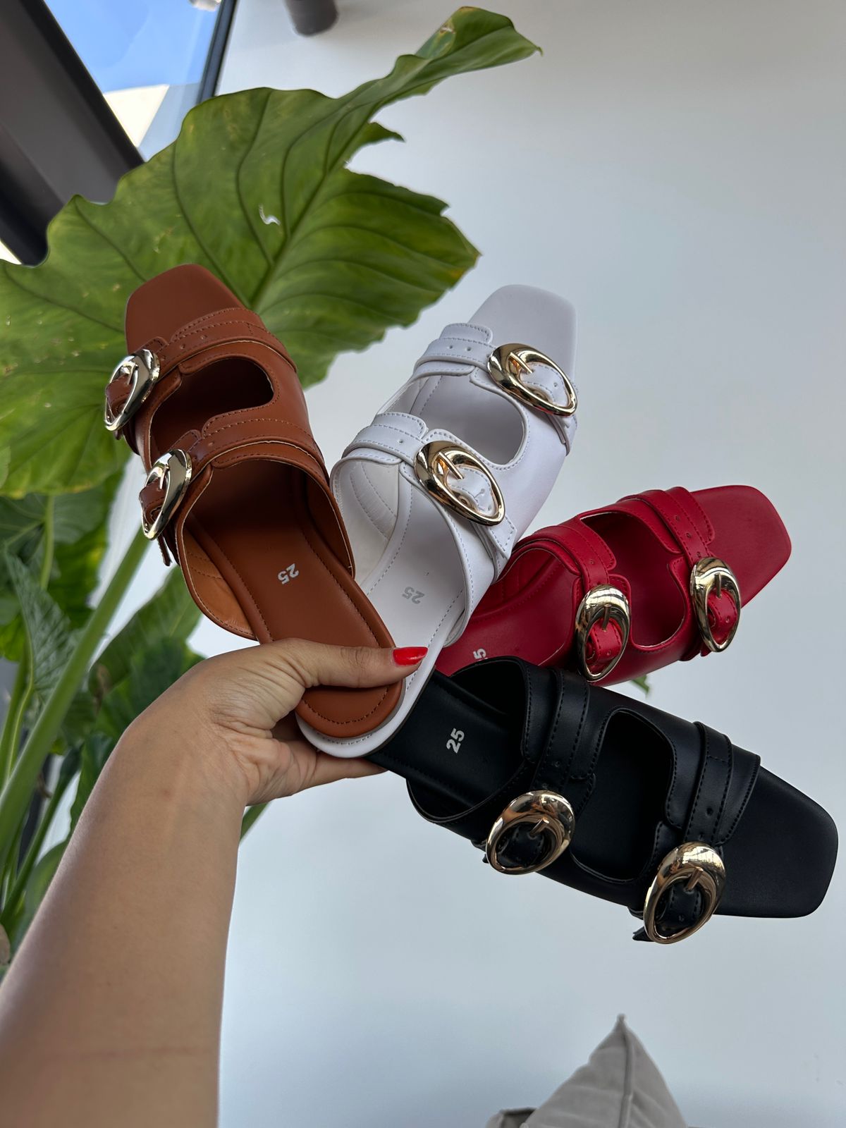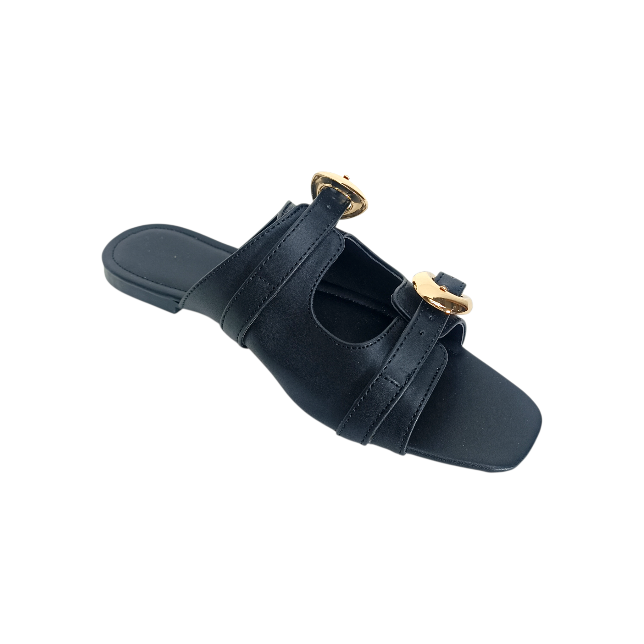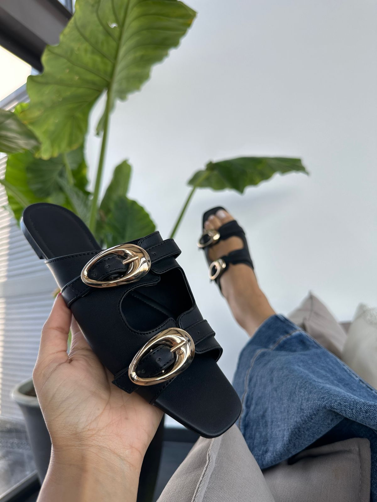 Descripción: Dale a tu look un toque elegante y moderno con estas sandalias tipo mule en color negro, el complemento perfecto para cualquier outfit de temporada. Su diseño minimalista se realza con dos tiras ajustables adornadas con hebillas metálicas doradas de gran tamaño, un detalle sofisticado que aporta estilo y personalidad.