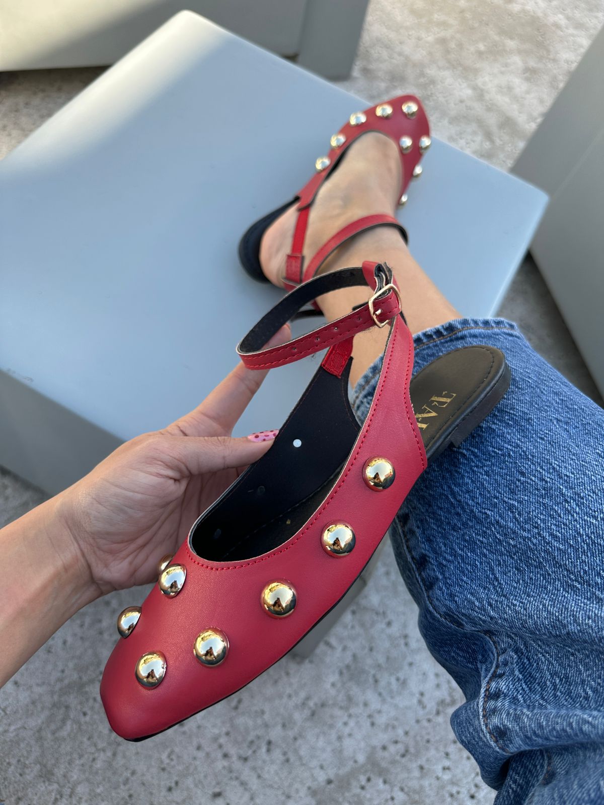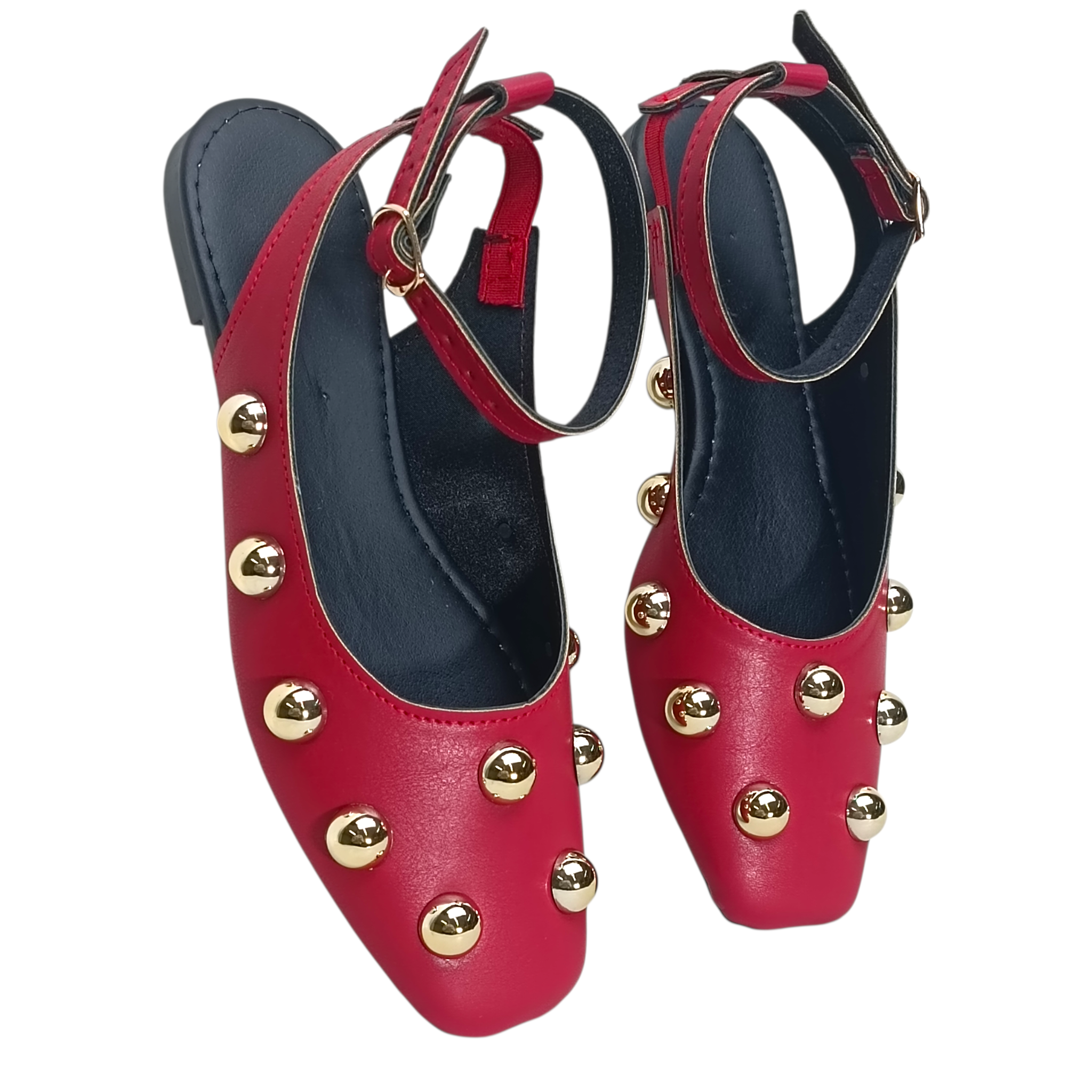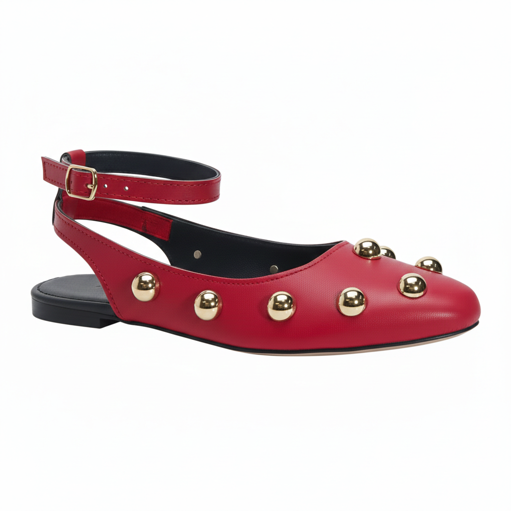 Descripción: Estas valerinas rojas con estoperoles dorados son el toque perfecto para elevar cualquier outfit. Su diseño moderno combina la elegancia clásica con un aire audaz gracias a los detalles metálicos distribuidos al frente, que aportan brillo y personalidad sin perder sofisticación.