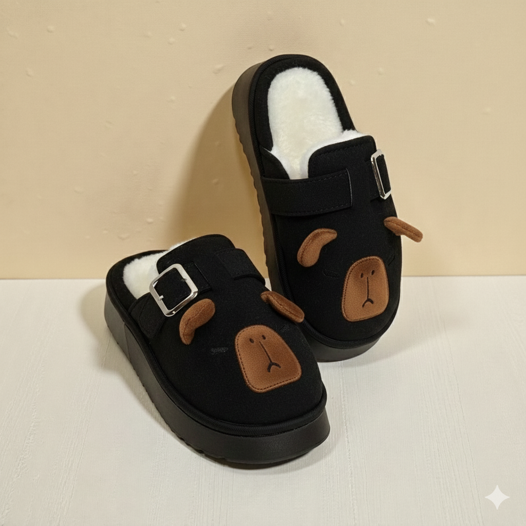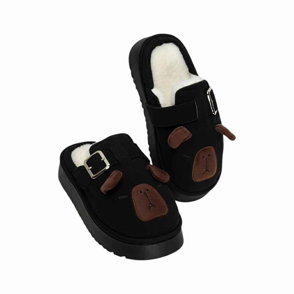 Descripción: Estas pantuflas estilo capibara son el combo perfecto entre ternura y comodidad. Su diseño adorable con orejitas y carita bordada roba miradas al instante, mientras que el interior afelpado tipo borrega mantiene tus pies calientitos en cualquier momento del día.