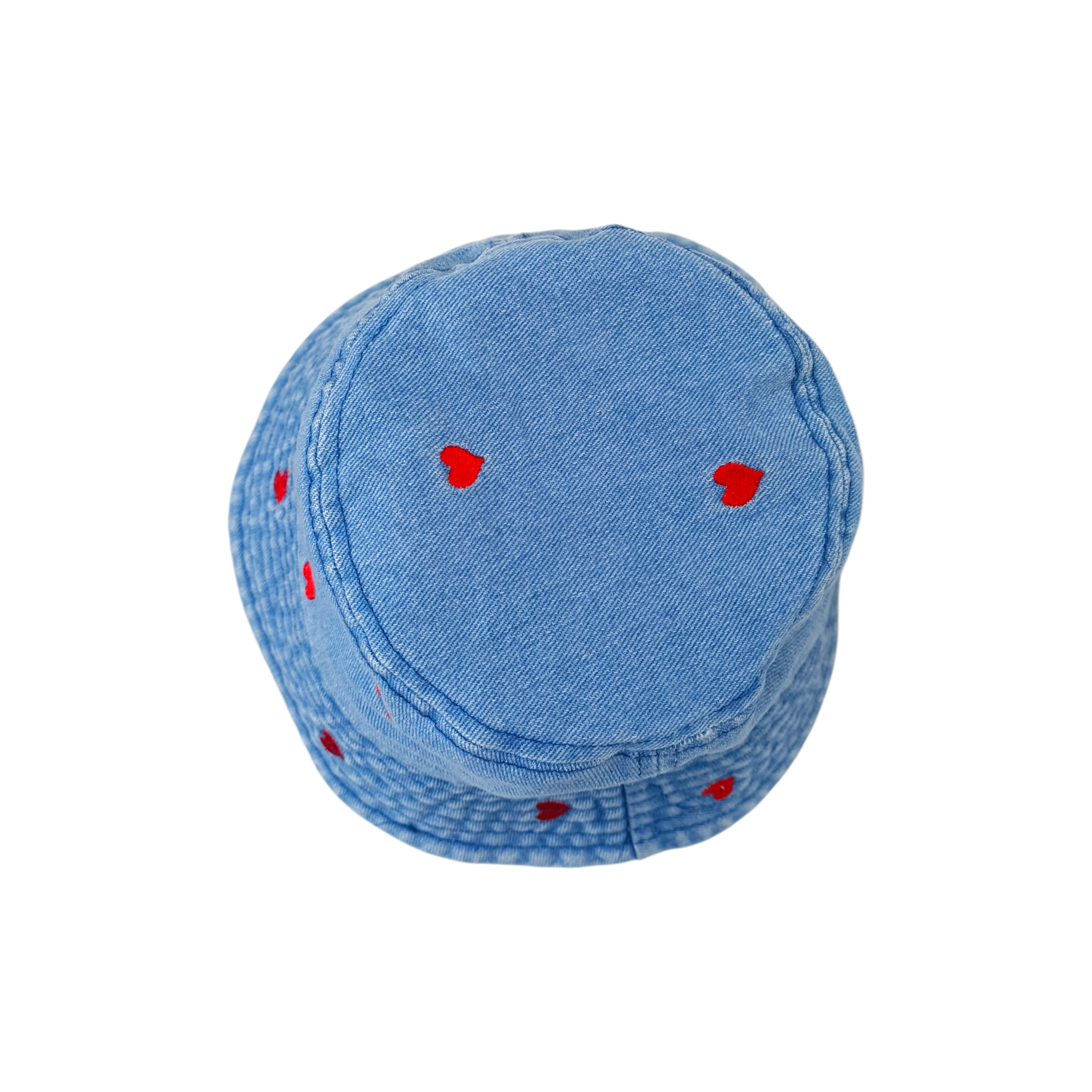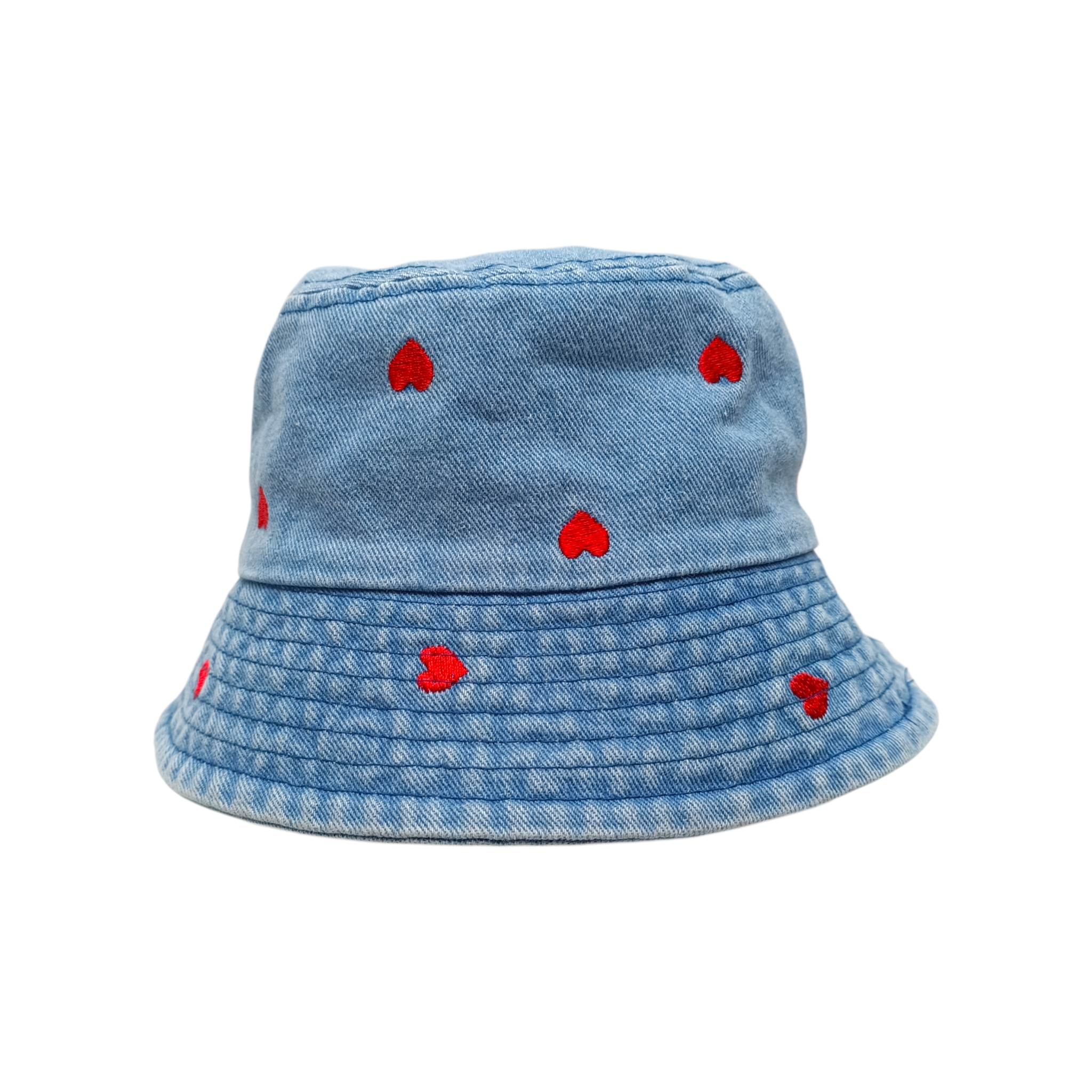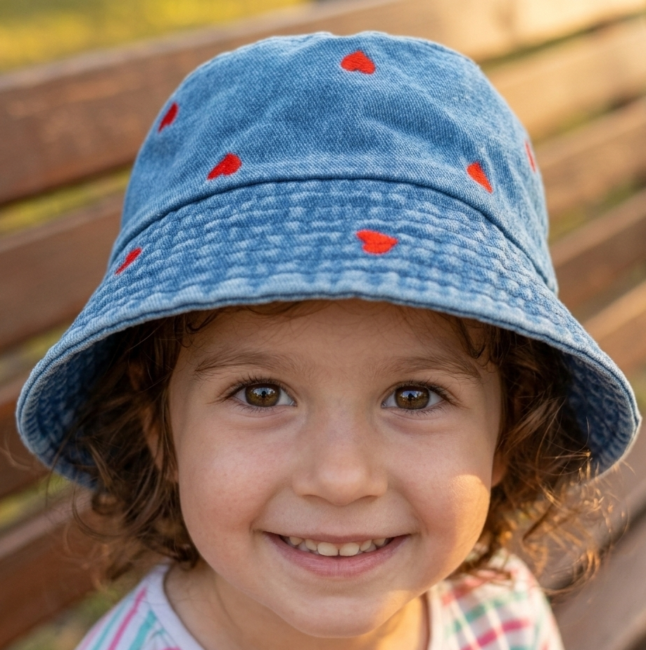 Descripción: Sombrero infantil estilo bucket confeccionado en mezclilla azul claro que destaca por su diseño tierno y moderno. Su delicado estampado de pequeños corazones rojos bordados añade un toque alegre y encantador, convirtiéndolo en un accesorio perfecto para complementar los outfits de las más pequeñas con un detalle dulce y divertido.