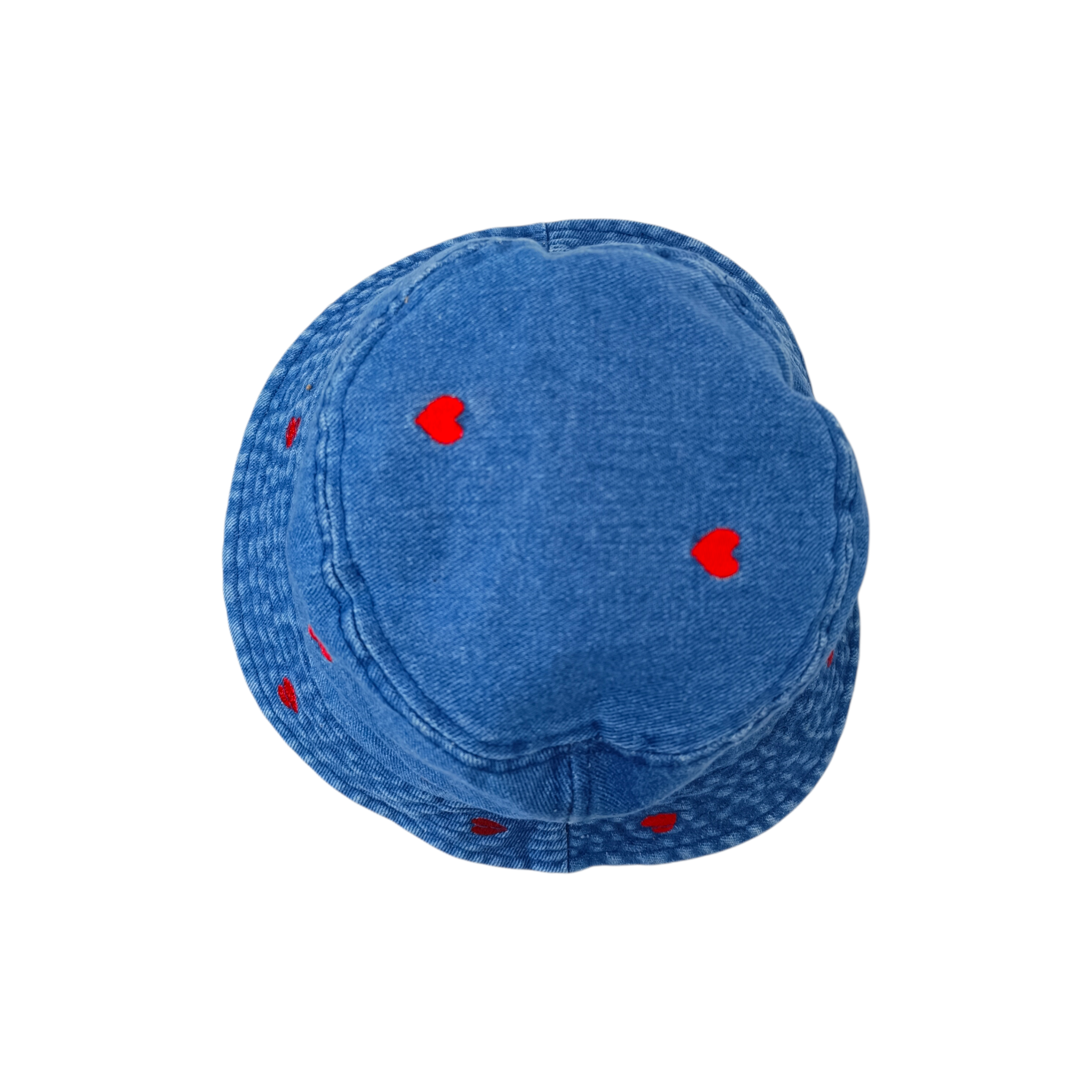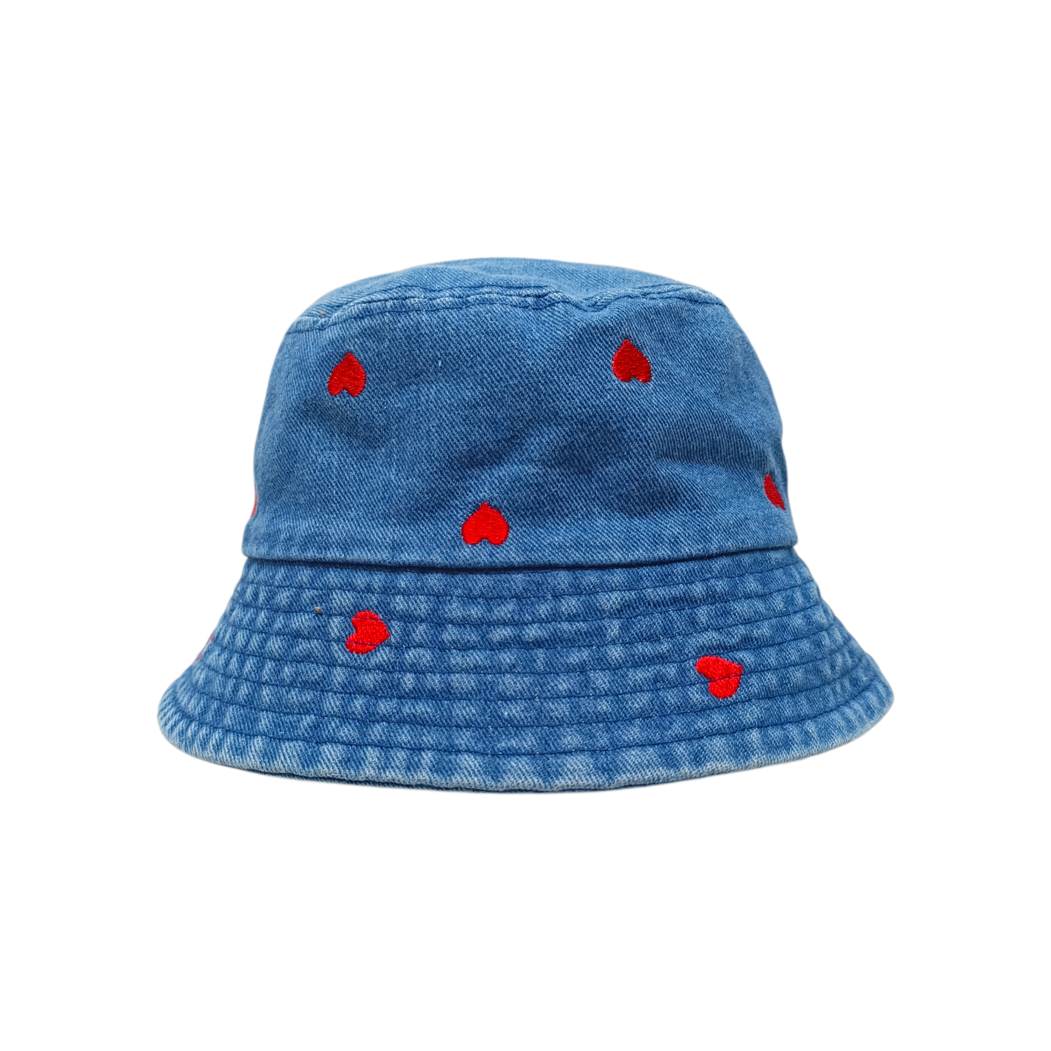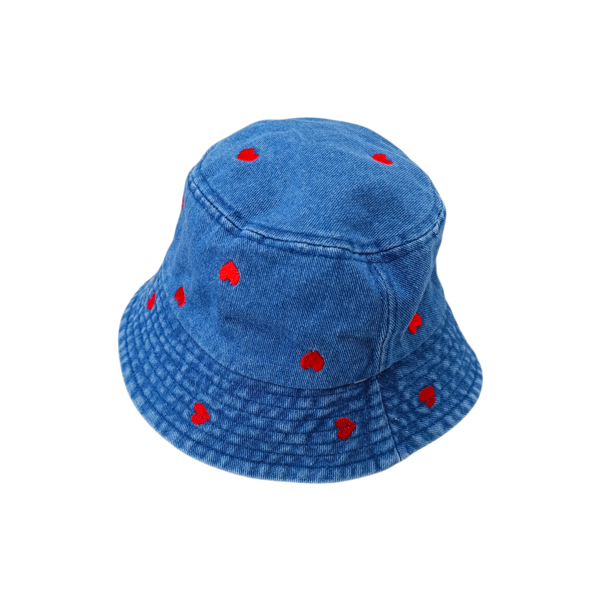 Descripción: Sombrero infantil estilo bucket confeccionado en mezclilla azul oscuro que destaca por su diseño tierno y moderno. Su delicado estampado de pequeños corazones rojos bordados añade un toque alegre y encantador, convirtiéndolo en un accesorio perfecto para complementar los outfits de las más pequeñas con un detalle dulce y divertido.