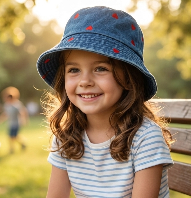 Elaborado con tela tipo mezclilla ligera, ofrece comodidad y frescura durante todo el día, mientras que su ala suave y flexible ayuda a proteger del sol sin perder su forma. Su diseño clásico tipo bucket permite un ajuste cómodo y seguro, ideal para acompañar a las niñas en paseos, días de parque o actividades al aire libre.