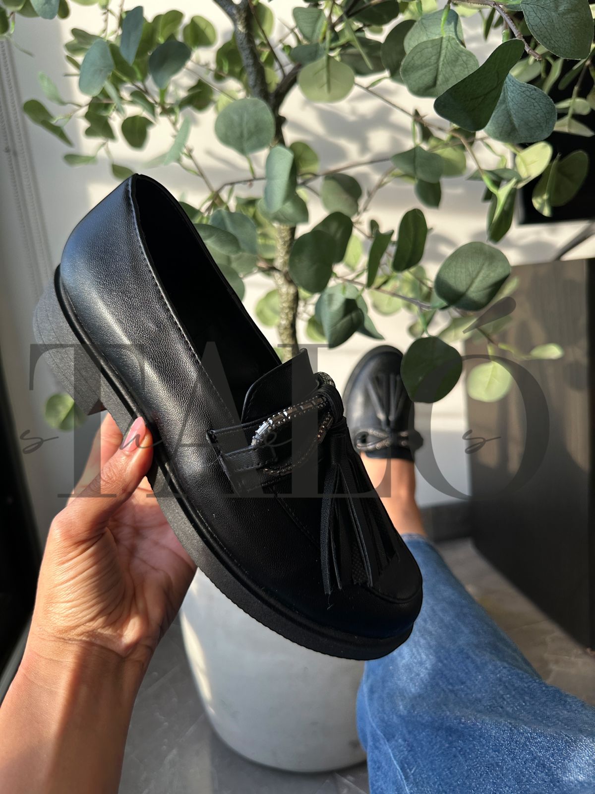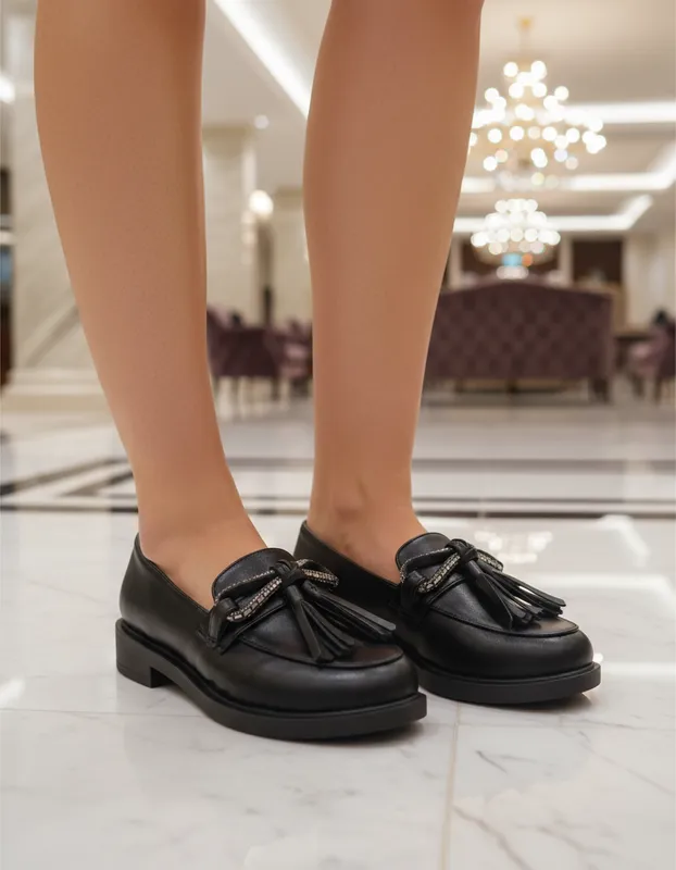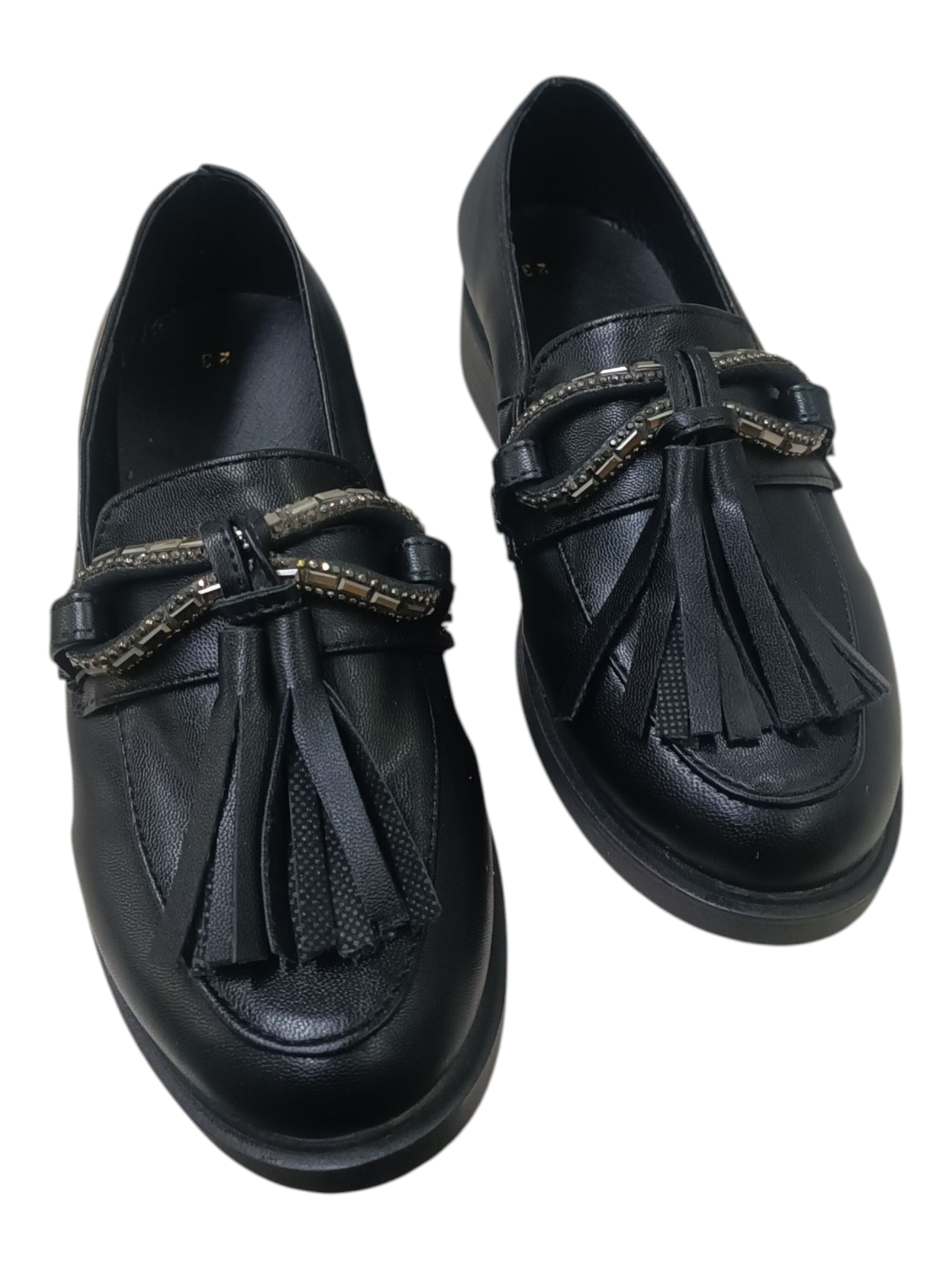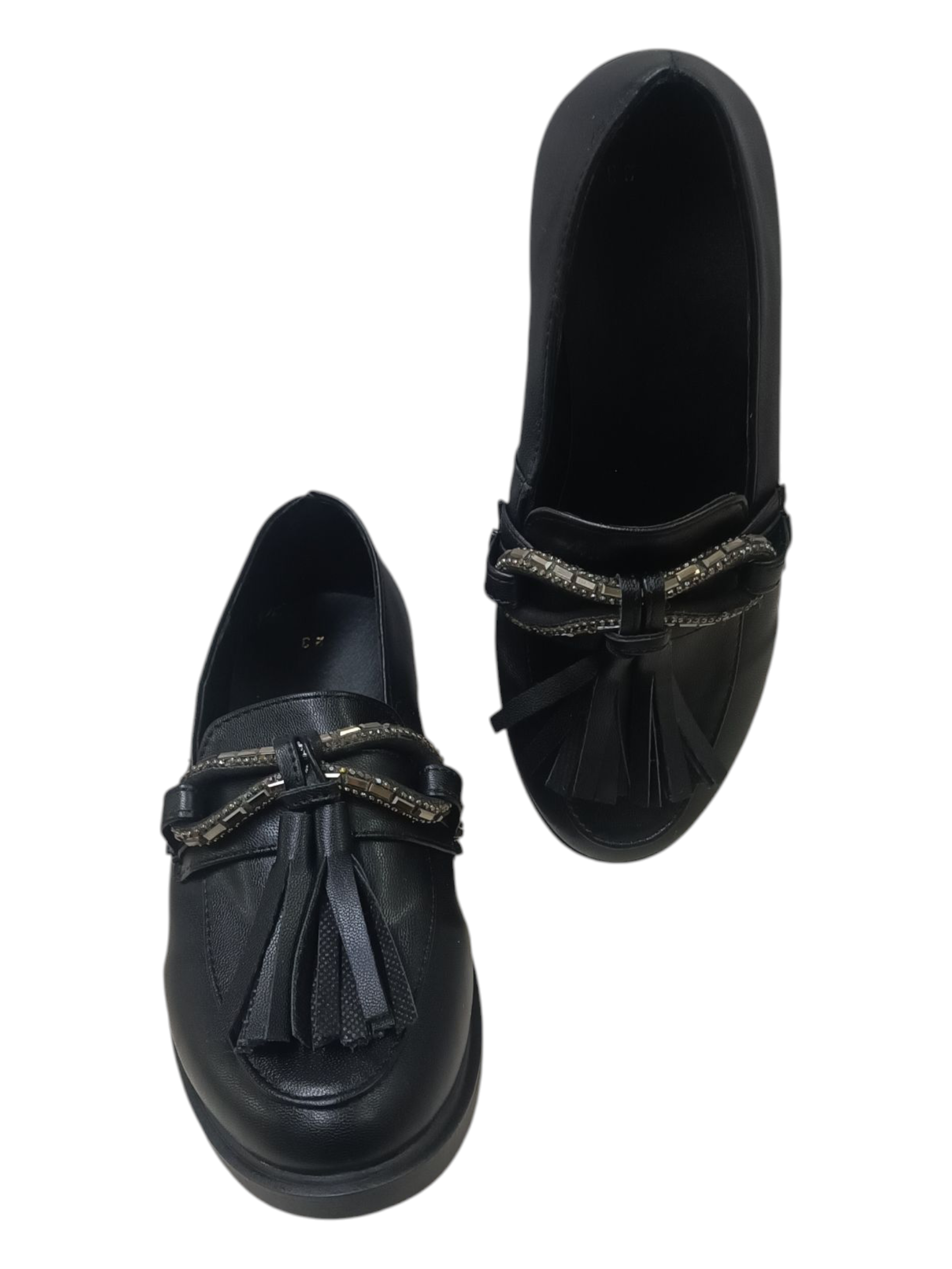 Dale un toque de distinción a tu outfit con estos mocasines negros de diseño elegante, elaborados en material sintético de alta calidad. Su detalle de moño con pedrería tipo cristal añade un aire sofisticado y moderno, ideal para resaltar en cualquier ocasión. El acabado tipo charol y las borlas decorativas al frente combinan lo clásico con lo contemporáneo, creando un calzado versátil que puedes usar tanto para eventos formales como para el día a día.