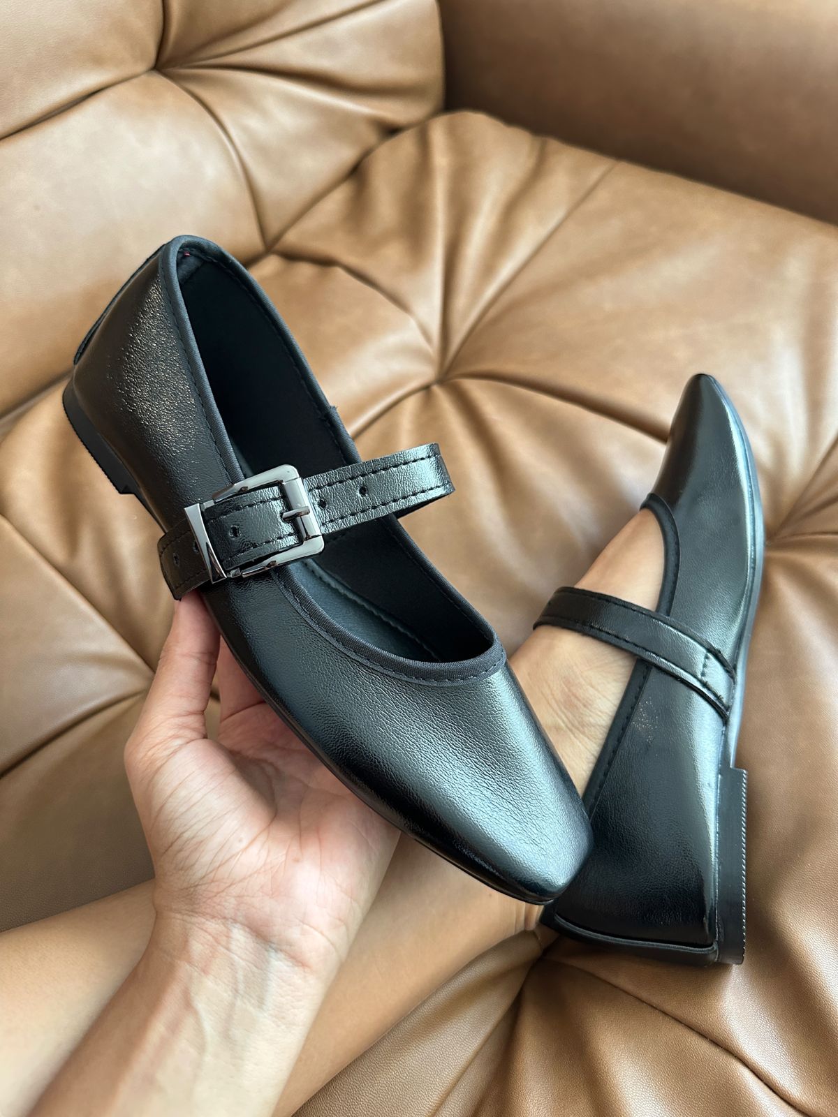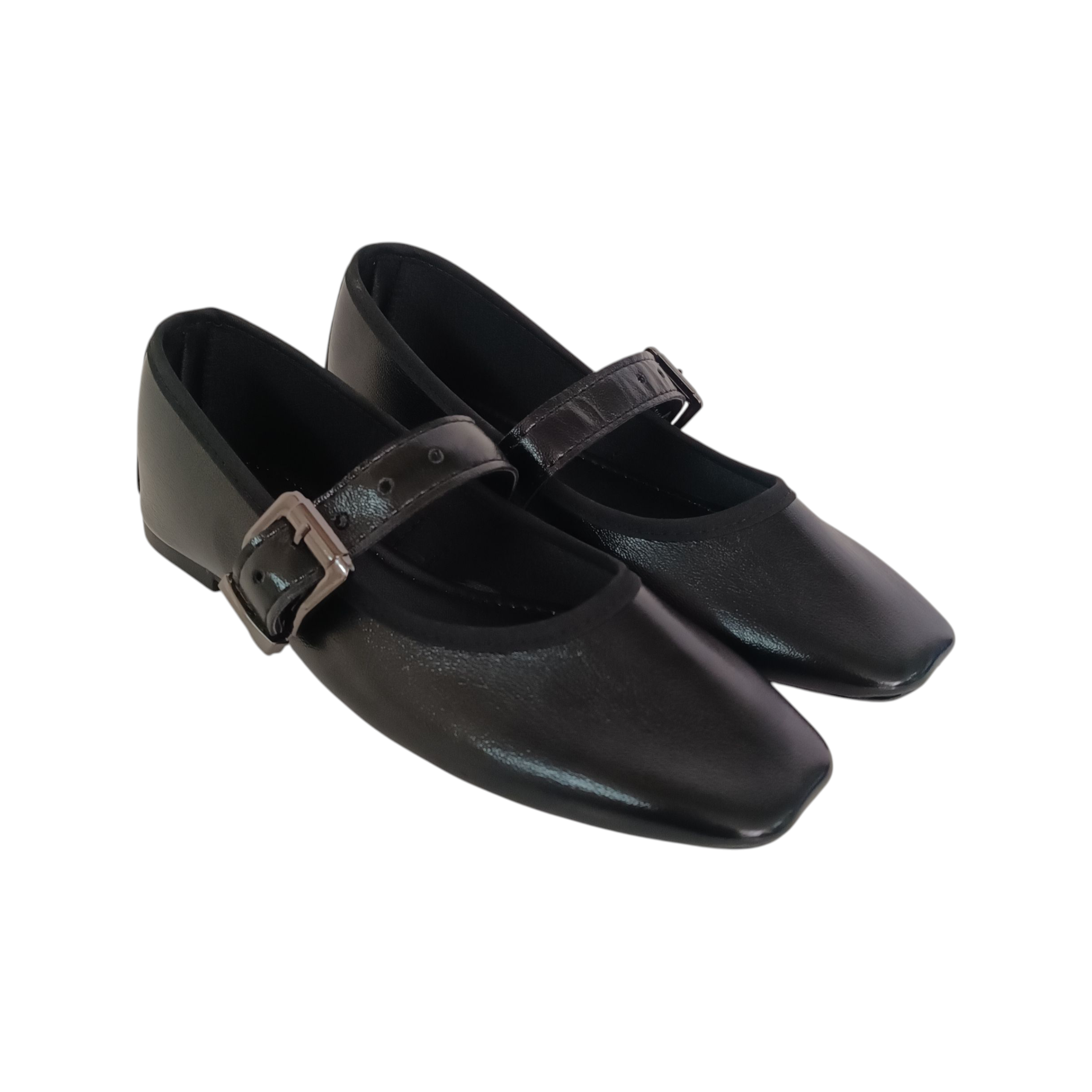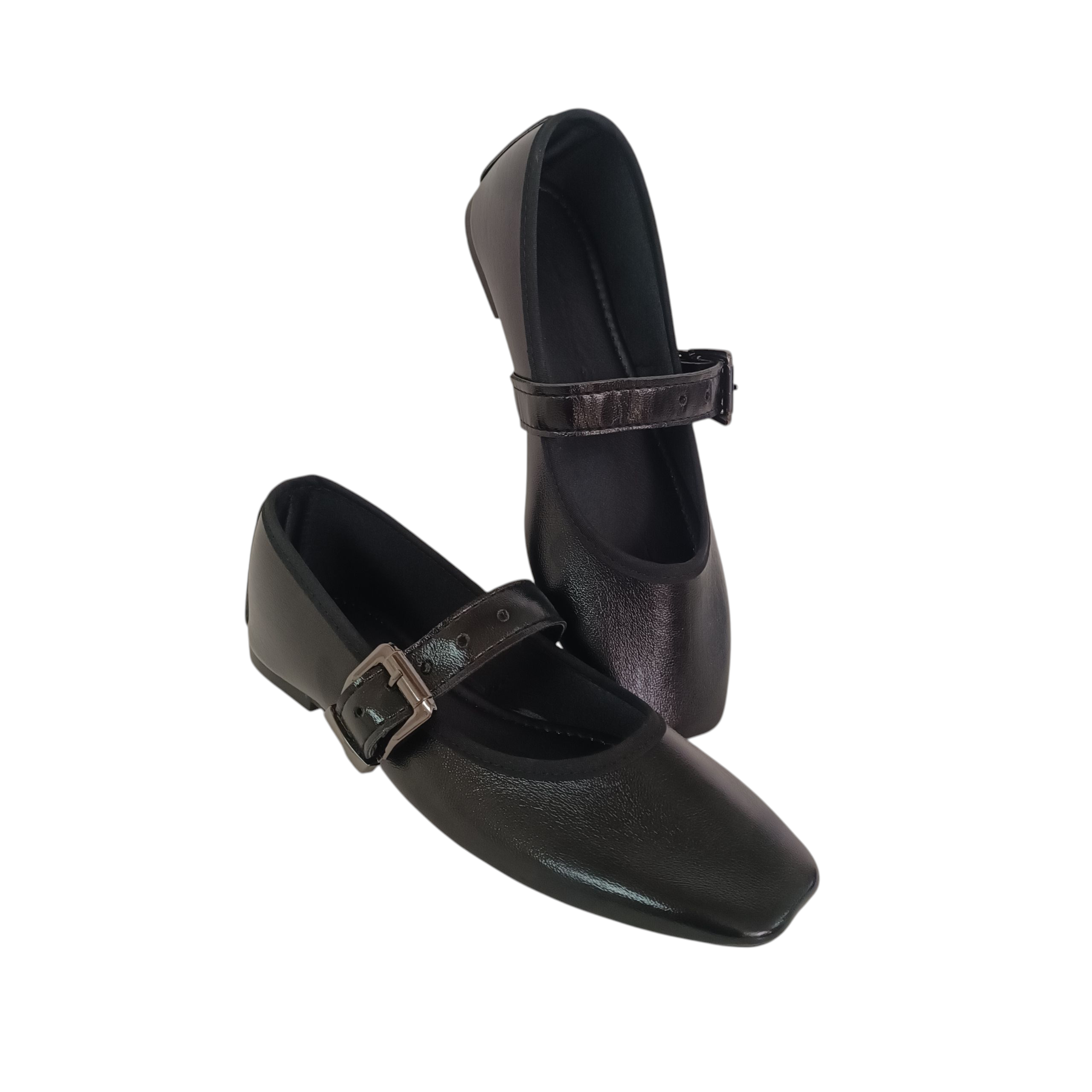 Descripción: Valerinas hechas con materiales sintéticos tipo morgan en color negro. Cuentan con una tira gruesa negra en la parte del empeine con una hebilla ajustable en color plateado. La suela es de material sintético en color negro.