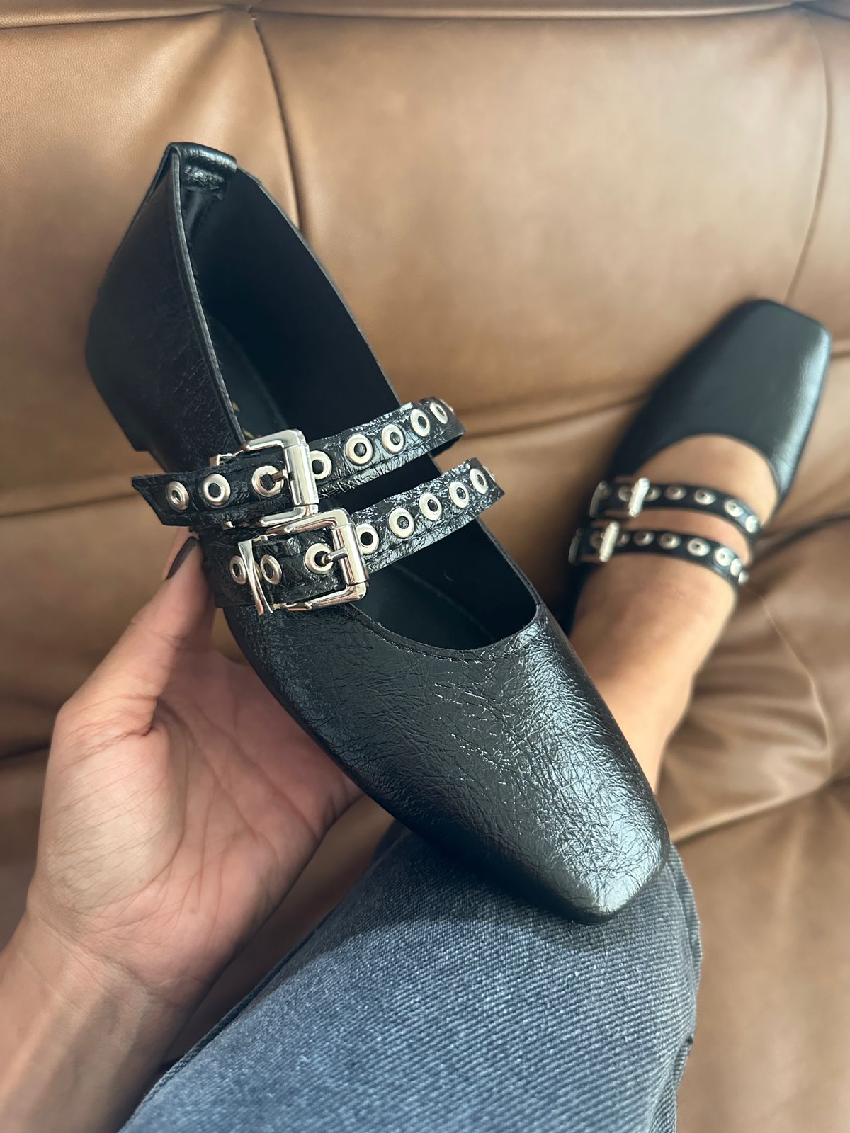 Detalle: Correa con hebilla metálica dorada