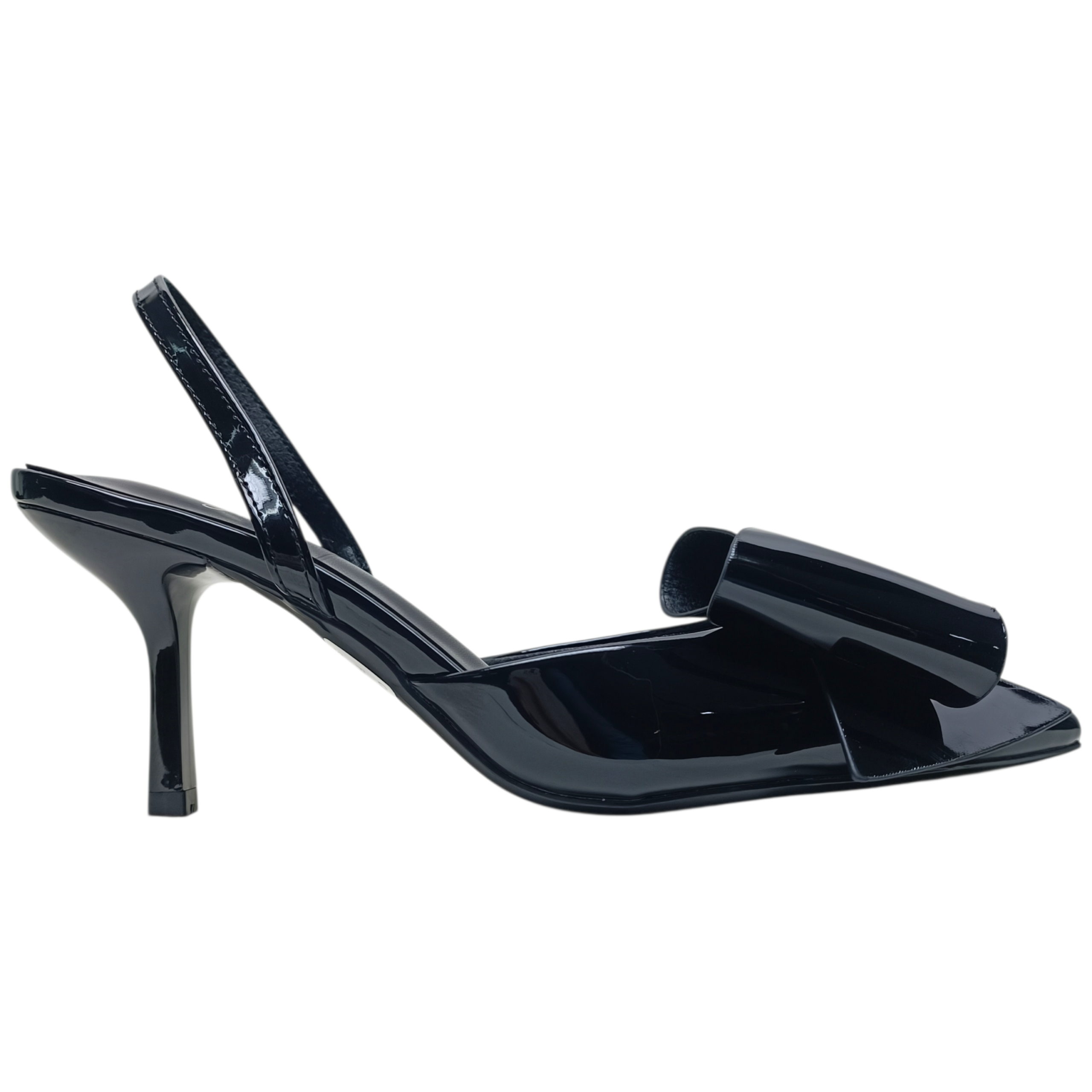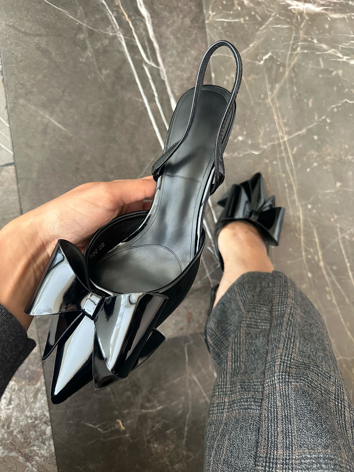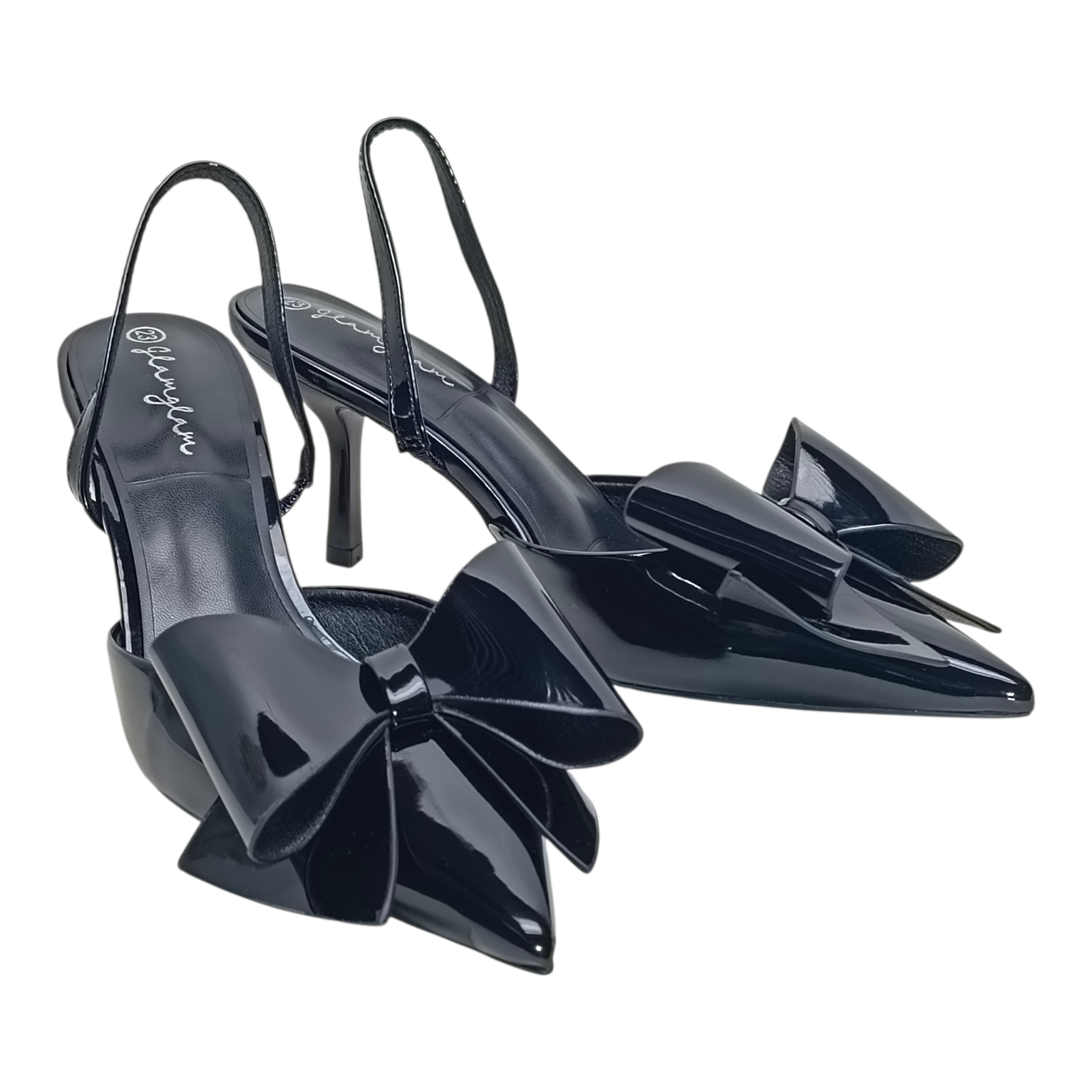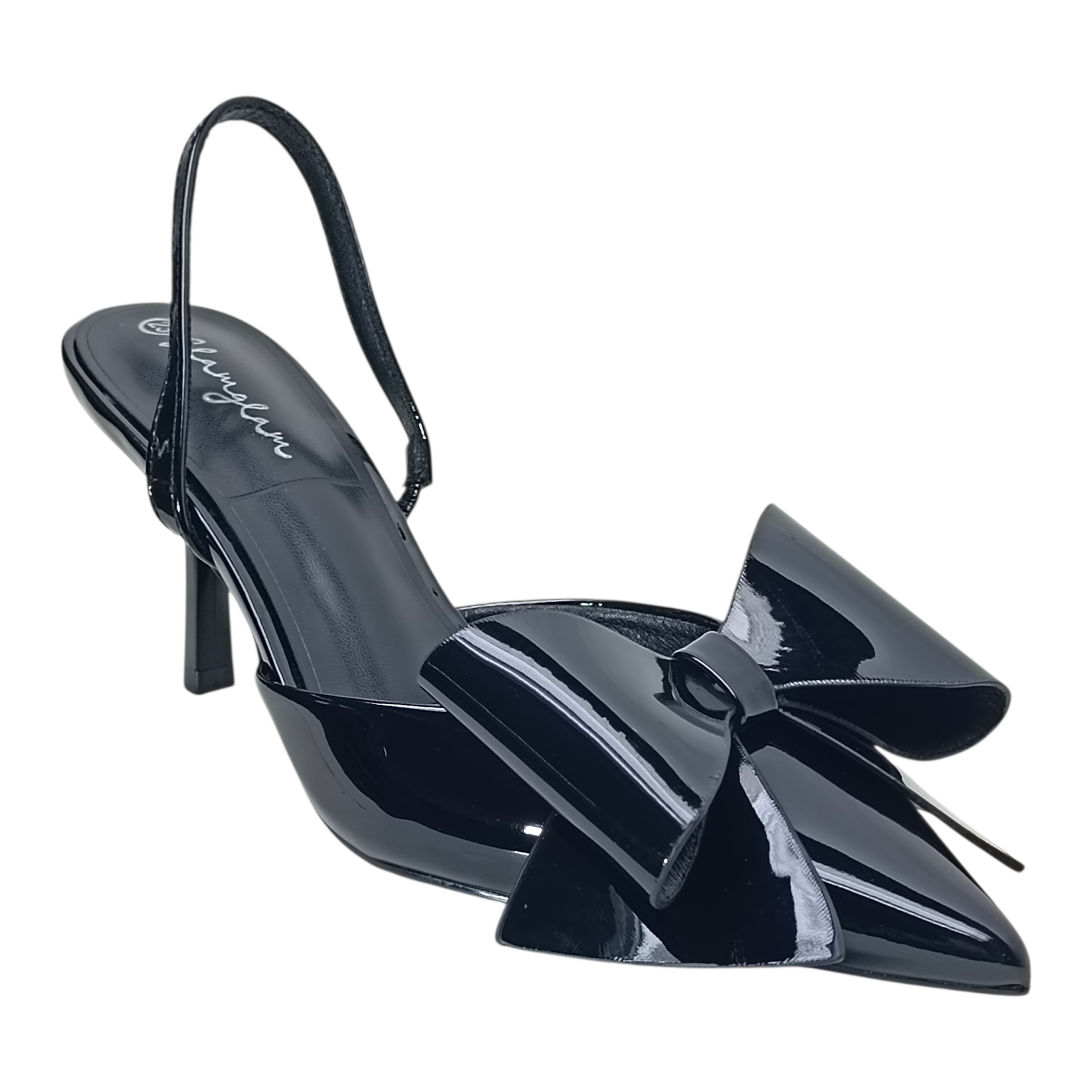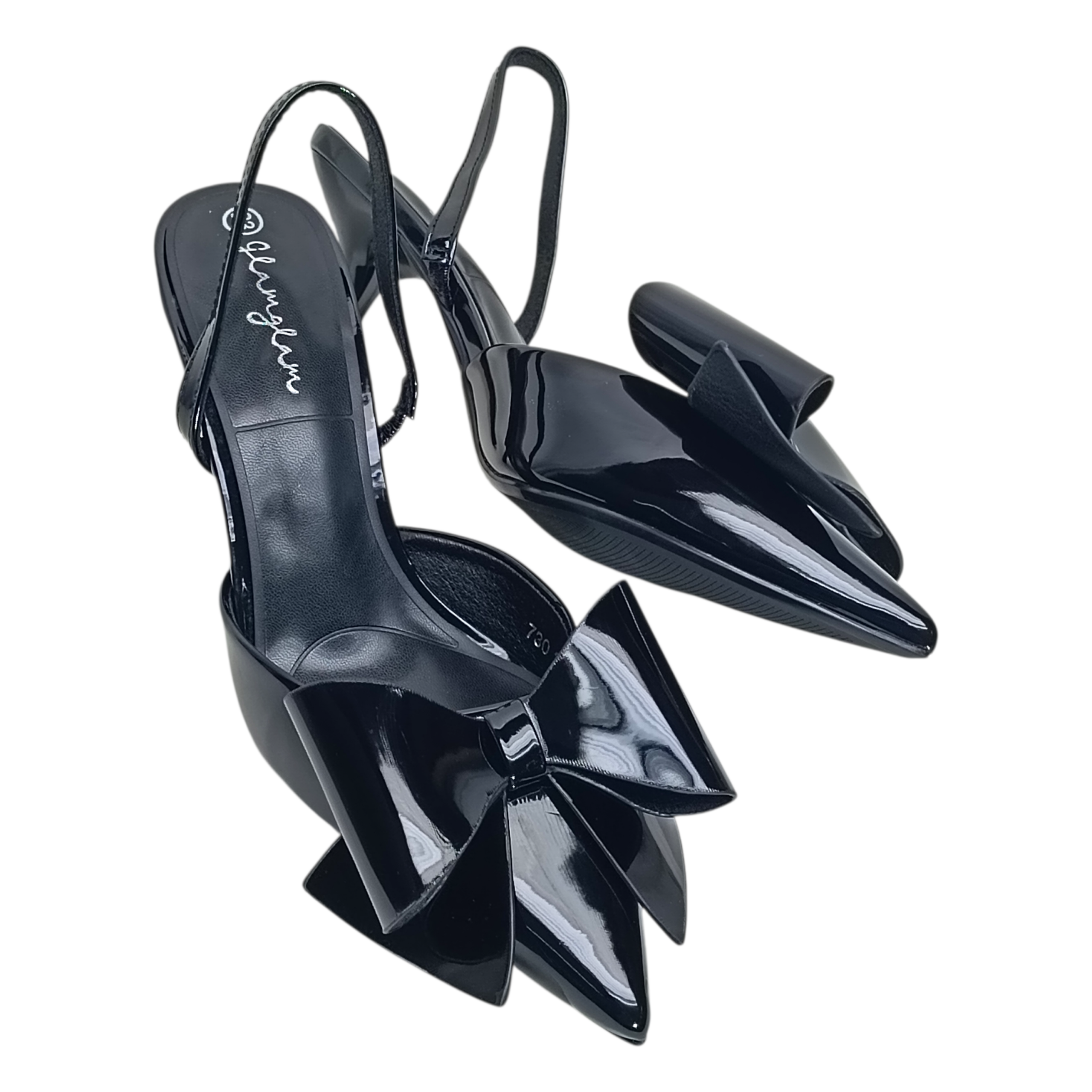 Descripción: Lindas y elegantes zapatillas estilo “Kitten Heels” fabricadas con materiales tipo charol, de alta calidad en color negro. Cuenta un par de correas no ajustable y delgadas como adorno en la parte del frente. El estilo de la punta es “puntiagudo”. Detalles y herrajes en tonos plateados. Sobre la punta, cuenta con un moño de gran tamaño con materiales sintéticos en color negro, lo que las hace ver más femeninas, resaltando cualquier estilo de otfit para este 2026.